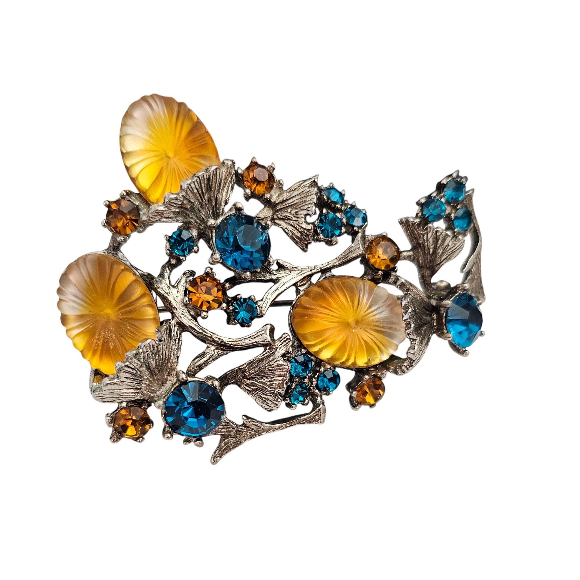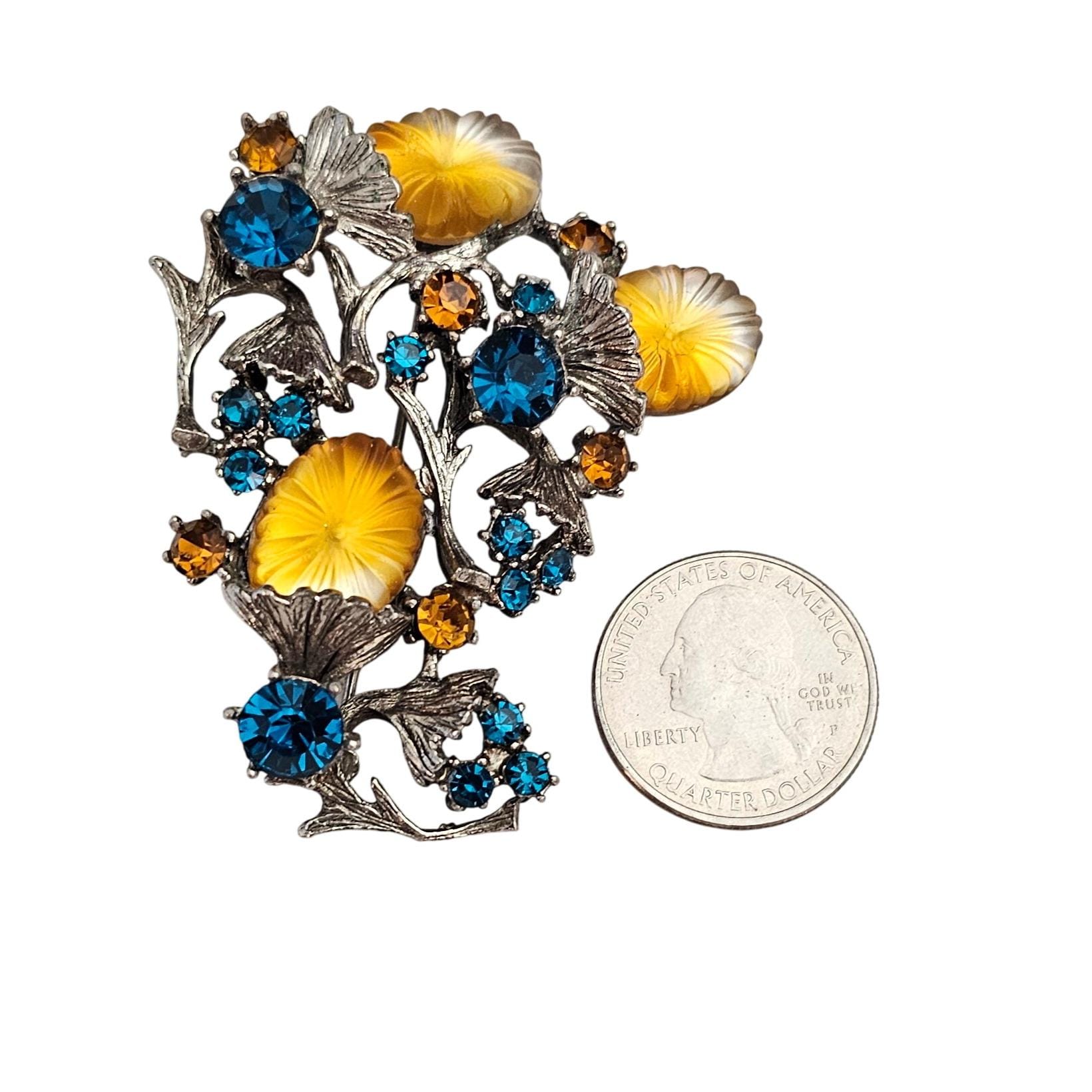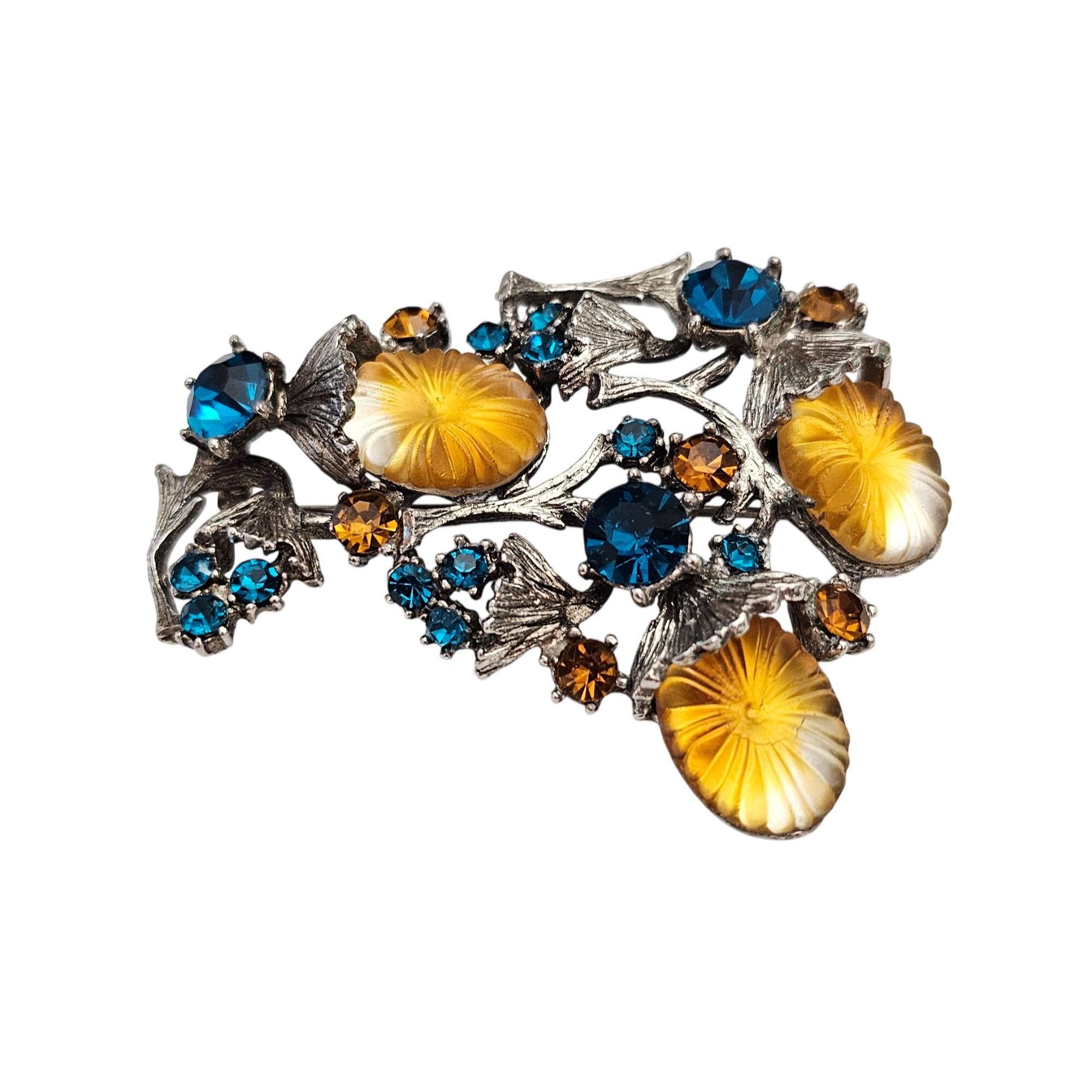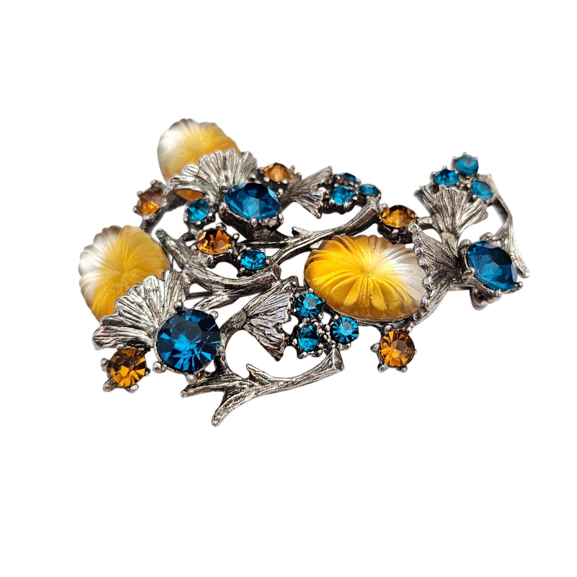HAR Rare Thistle Style Brooch Yellow Givre Blue Rhinestone Pin Signed, J474