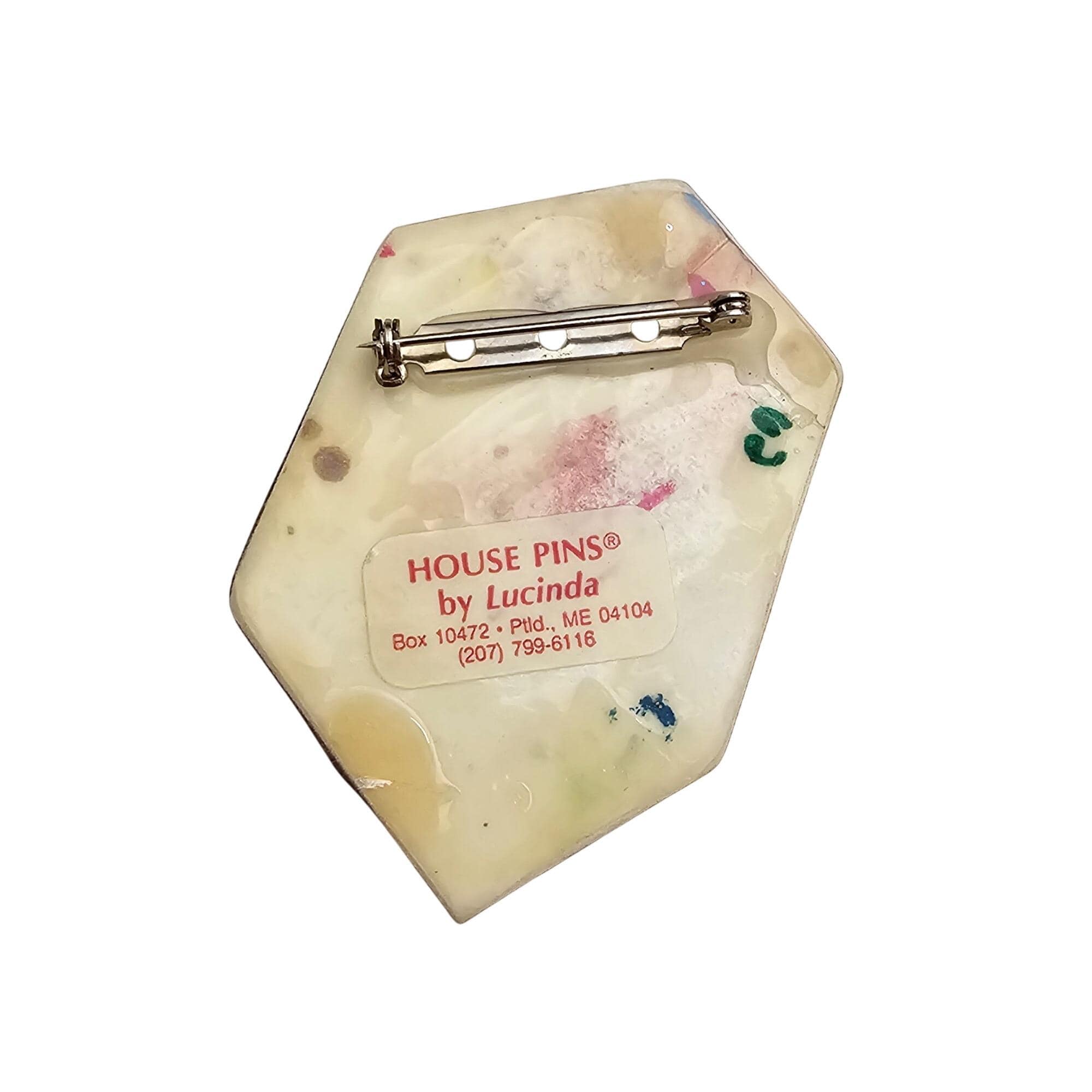 • The back of this pin has a sticker labeled HOUSE PINS by Lucinda with business address and telephone numbers
