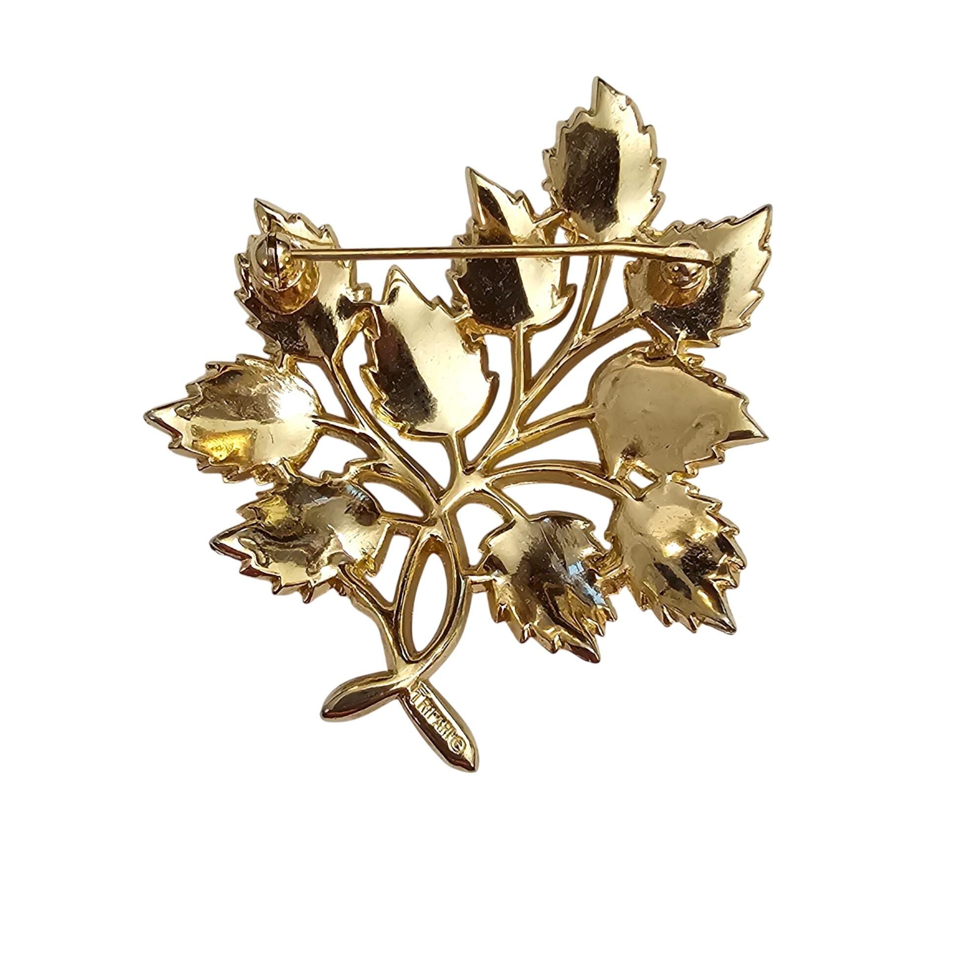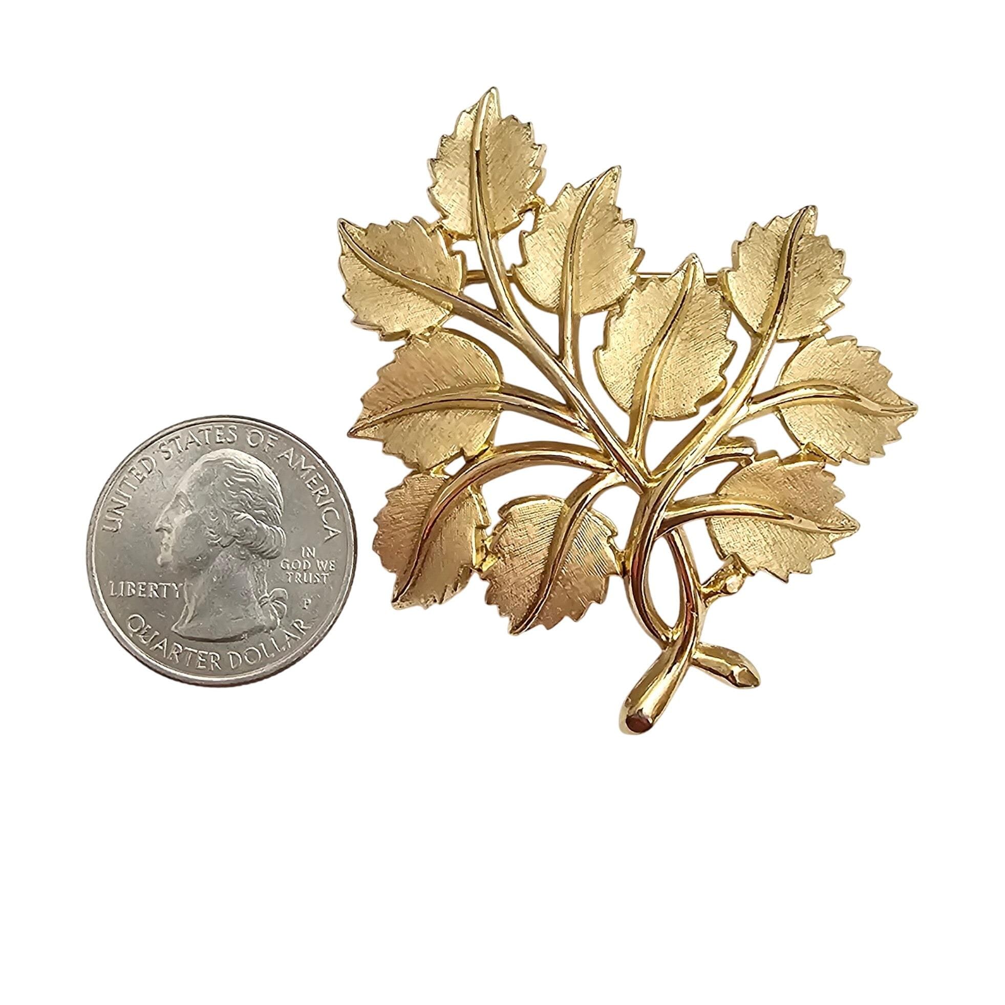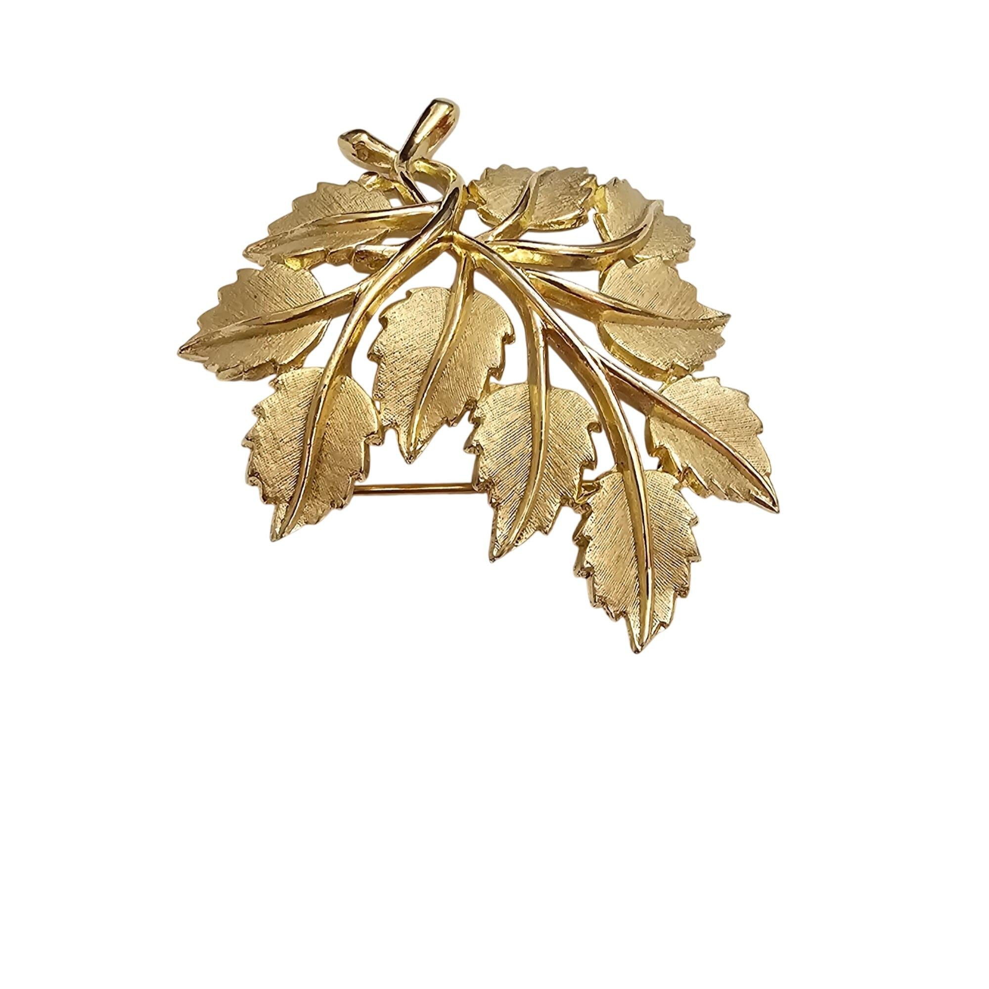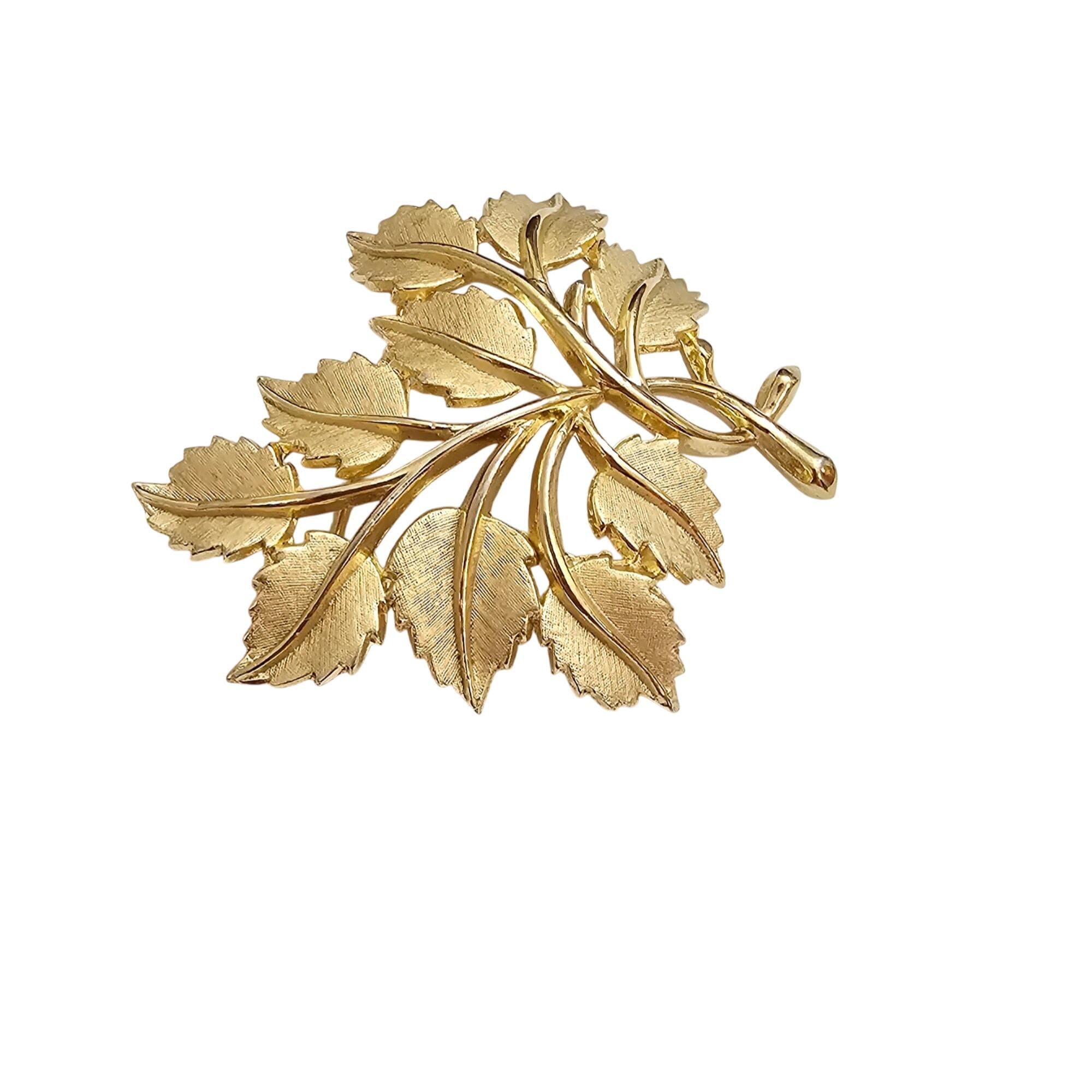 Trifari Crown Over T Linen Finish Leaf Brooch Leaves Branch Gold Tone Pin Signed J501