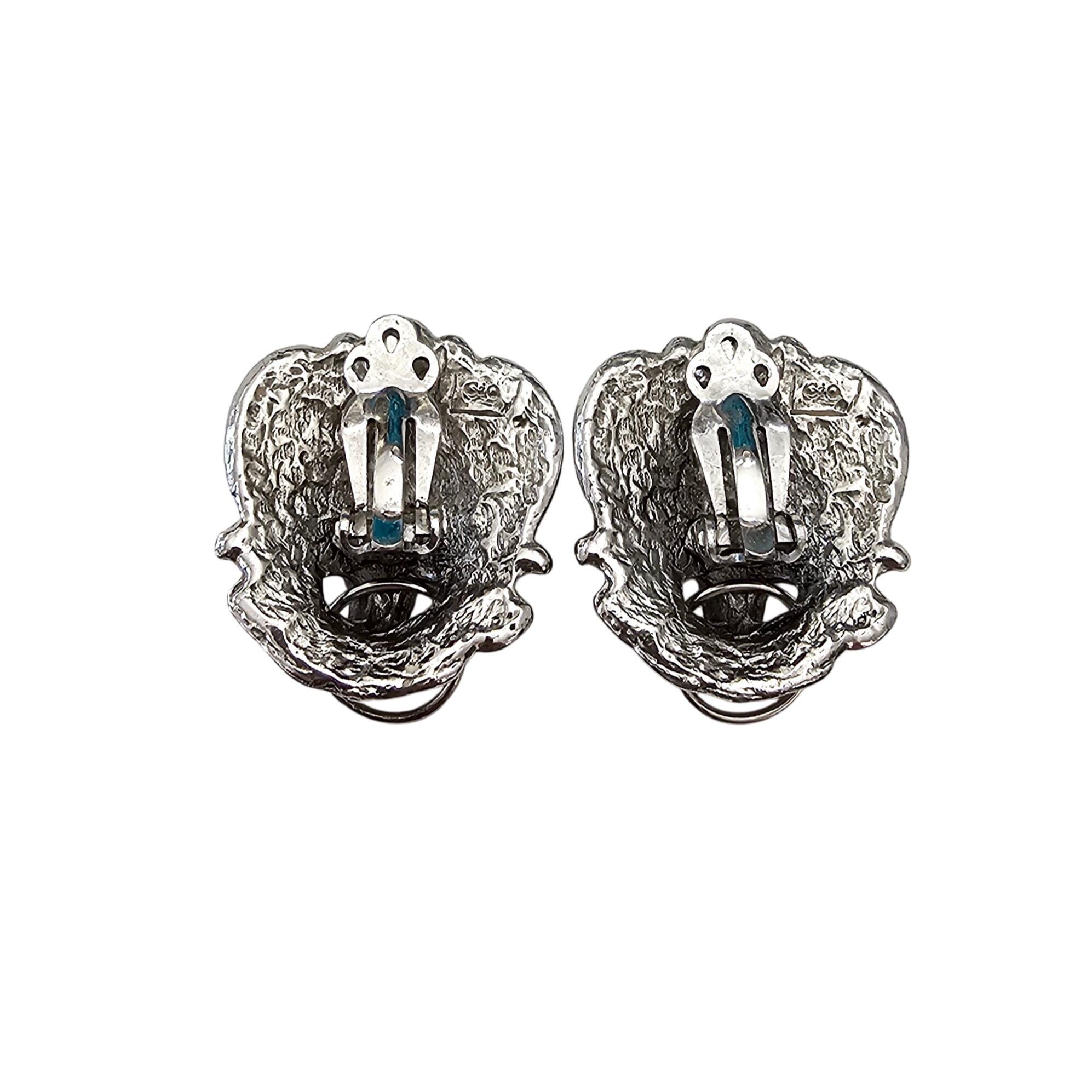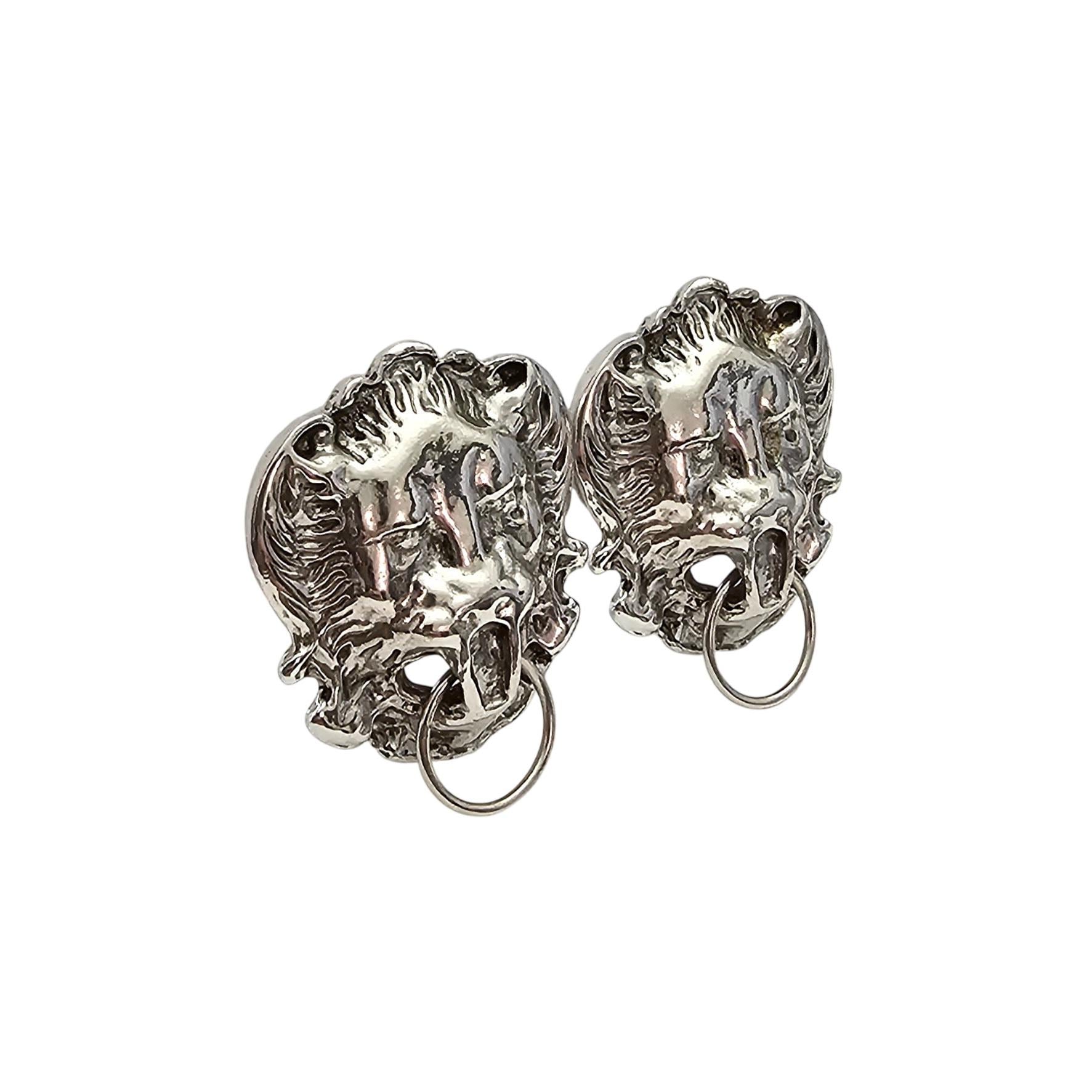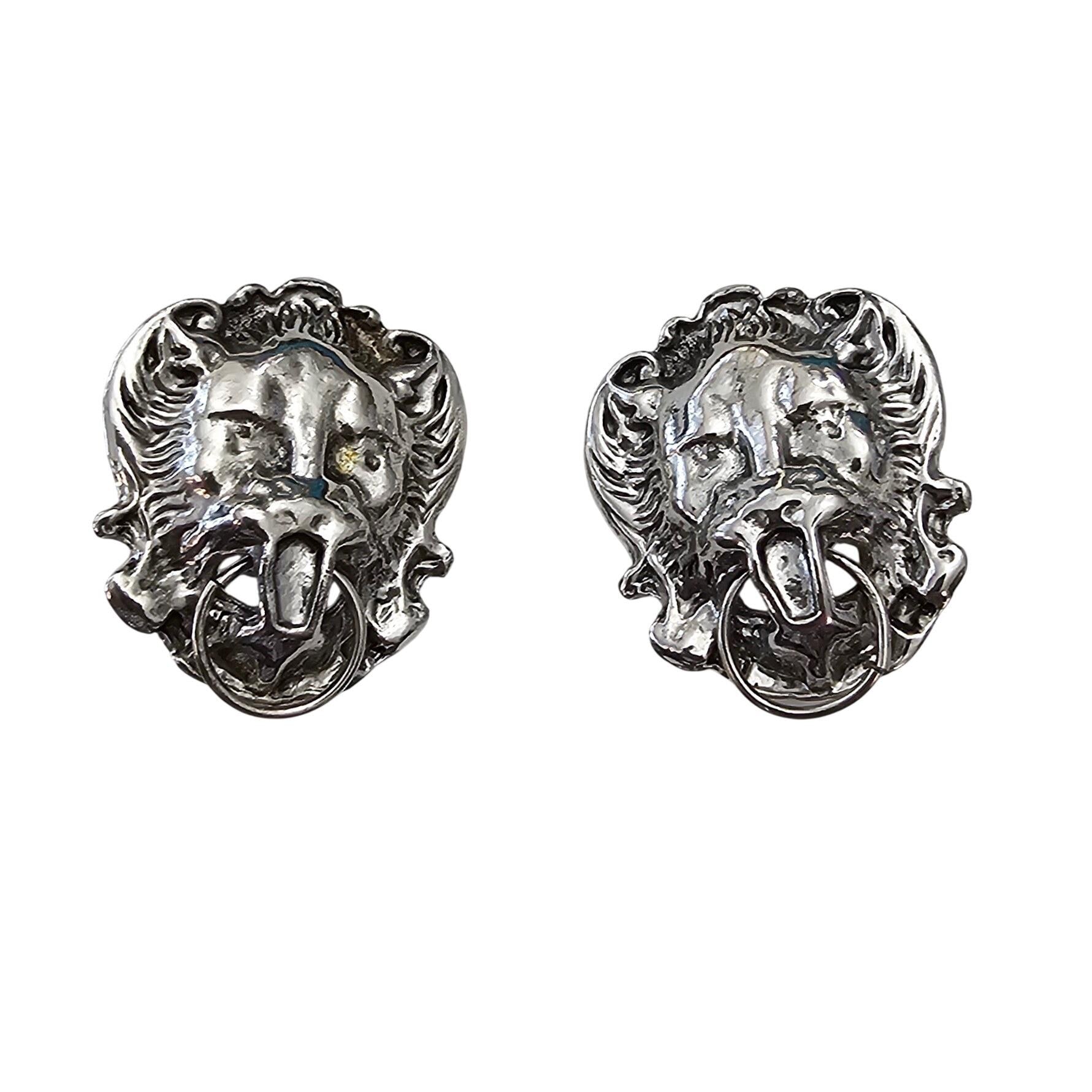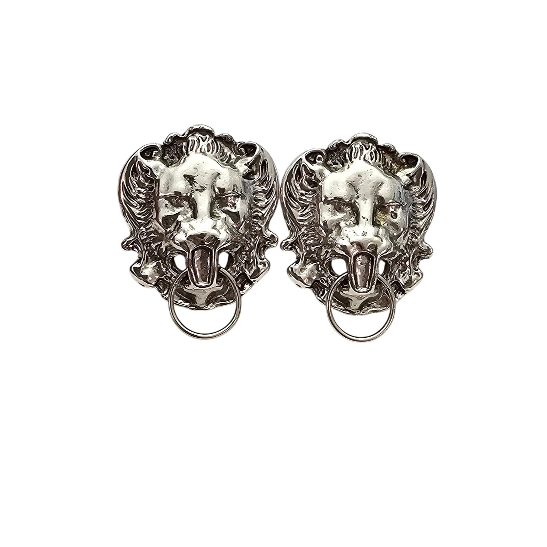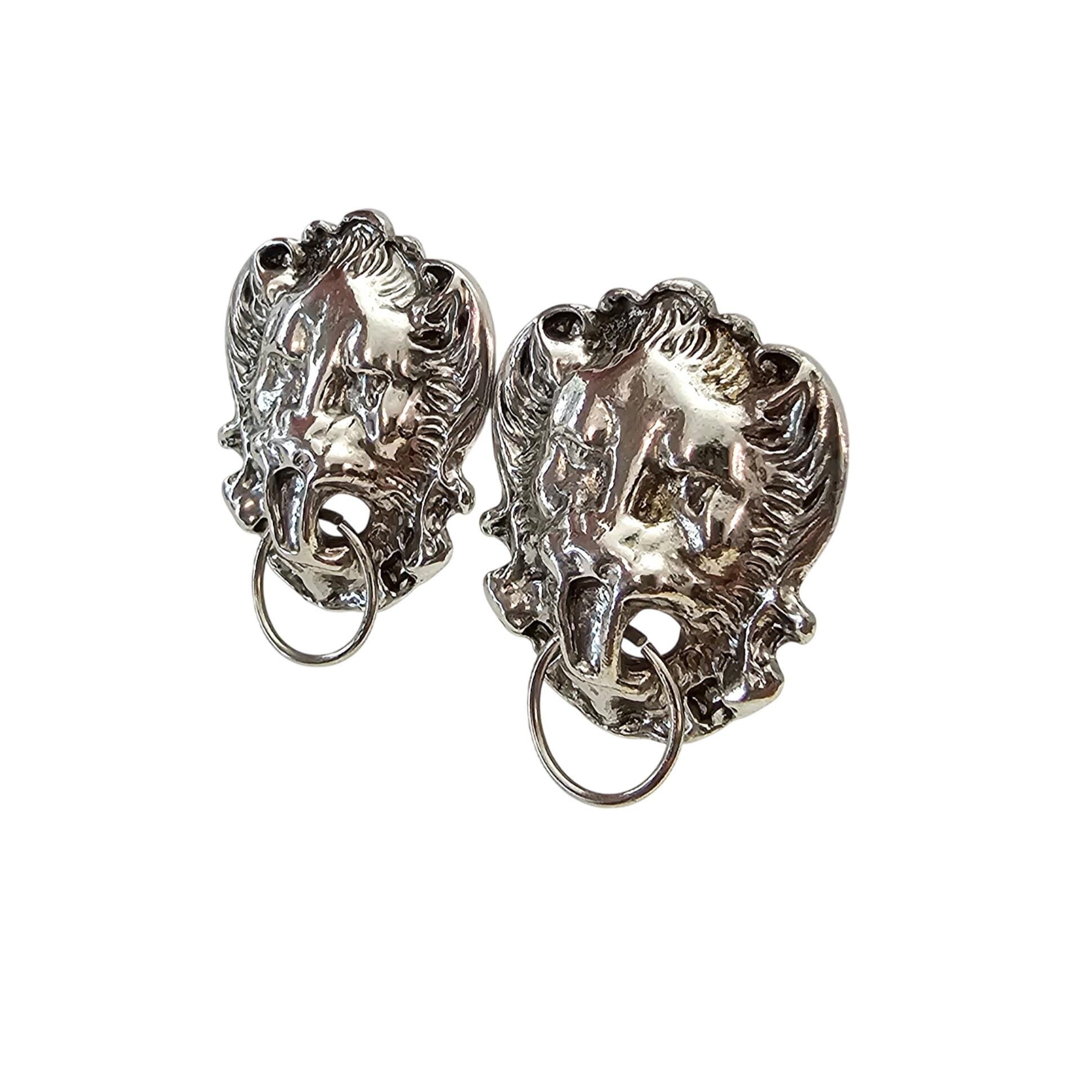 Gio Lion's Head Knocker Style Clip On Silver Tone Earrings Signed, J526