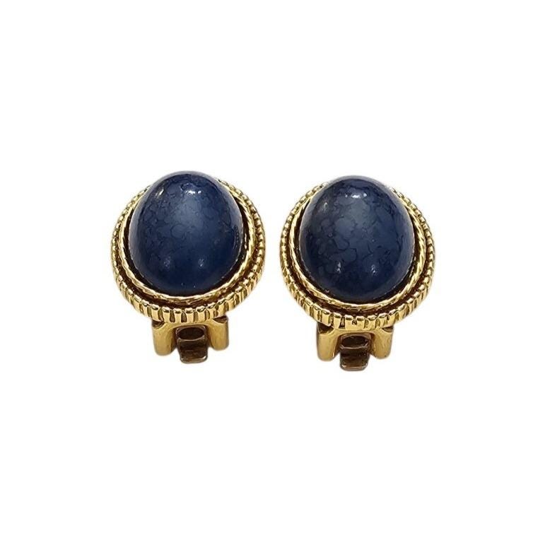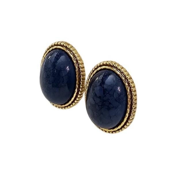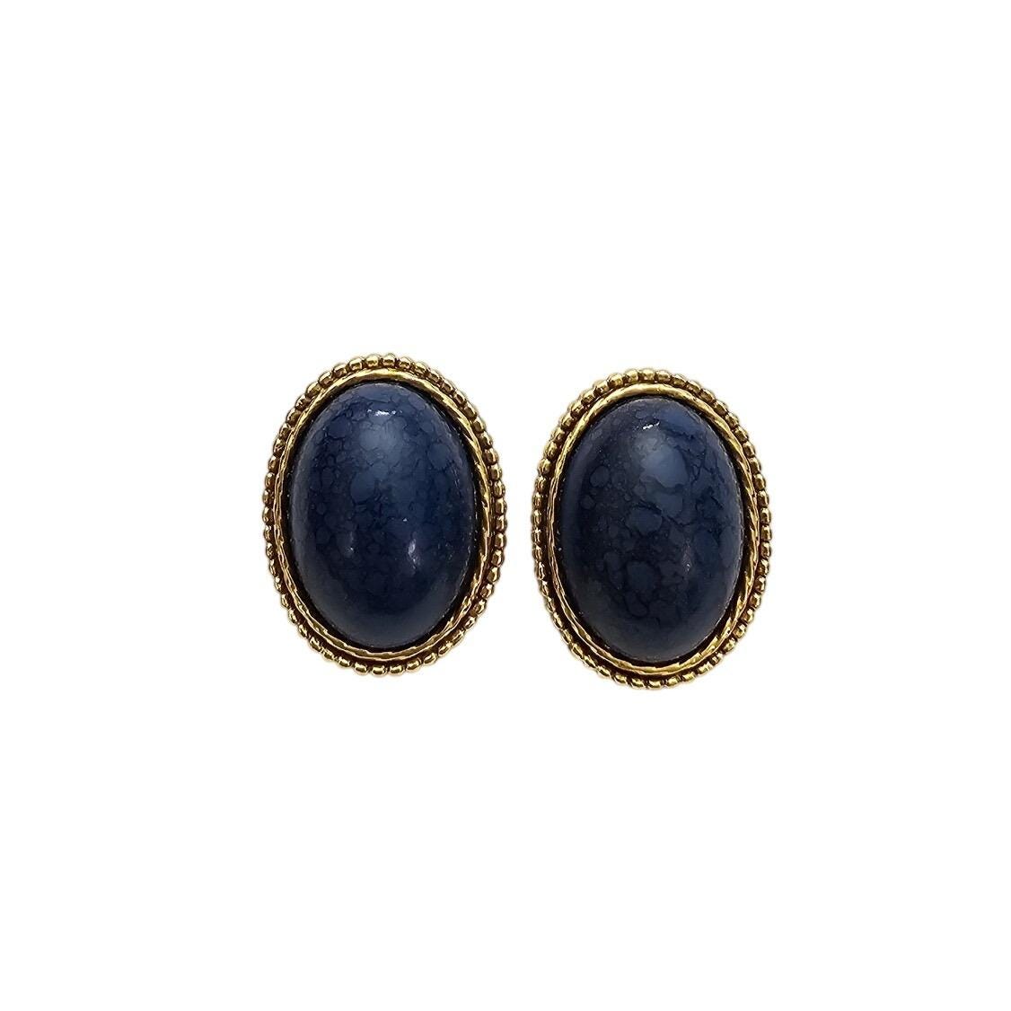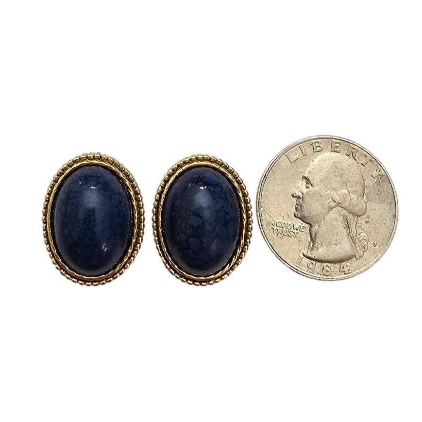 1928 Brand Oval Blue Marble Lucite Clip On Gold Tone Ribbed Earrings J564