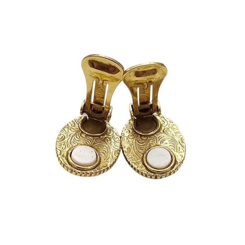 • Both earrings are unsigned but have a distinctive scroll-like or ornate textured pattern on the reverse side
