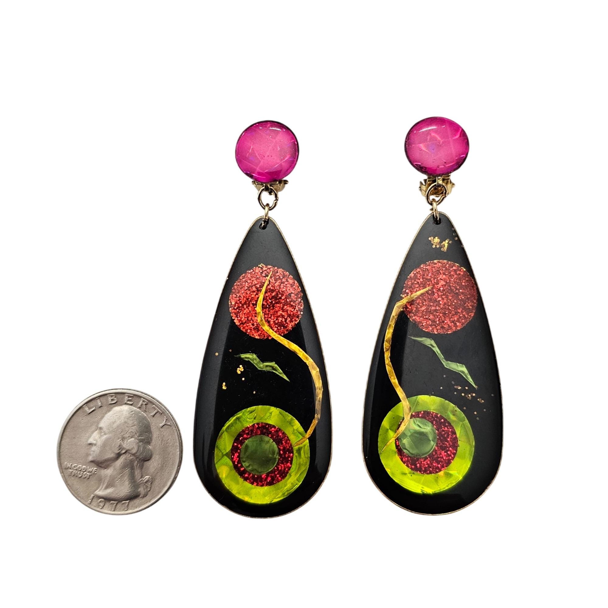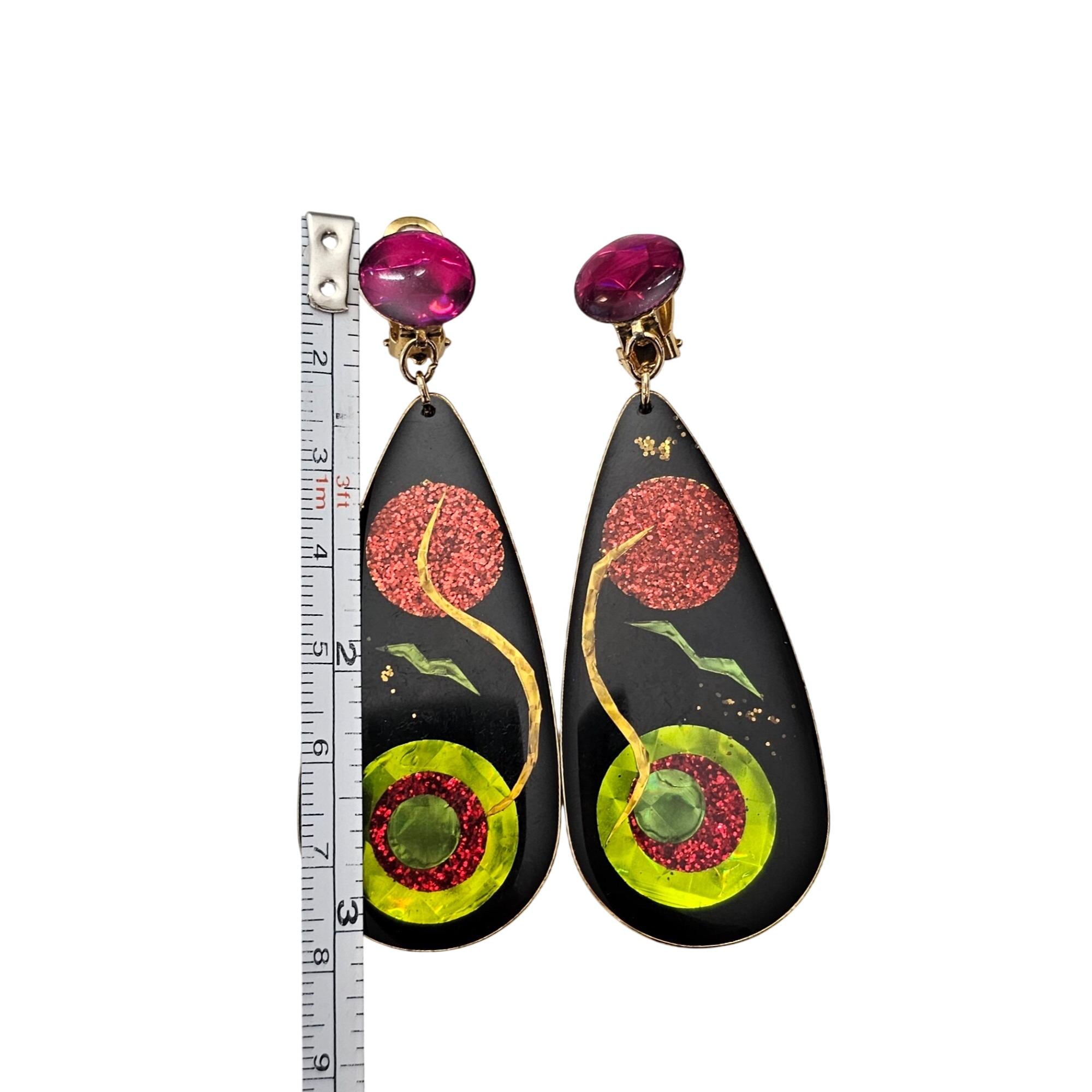 Vintage Clip On Green Black Holographic Print Teardrop Dangle Earrings J550