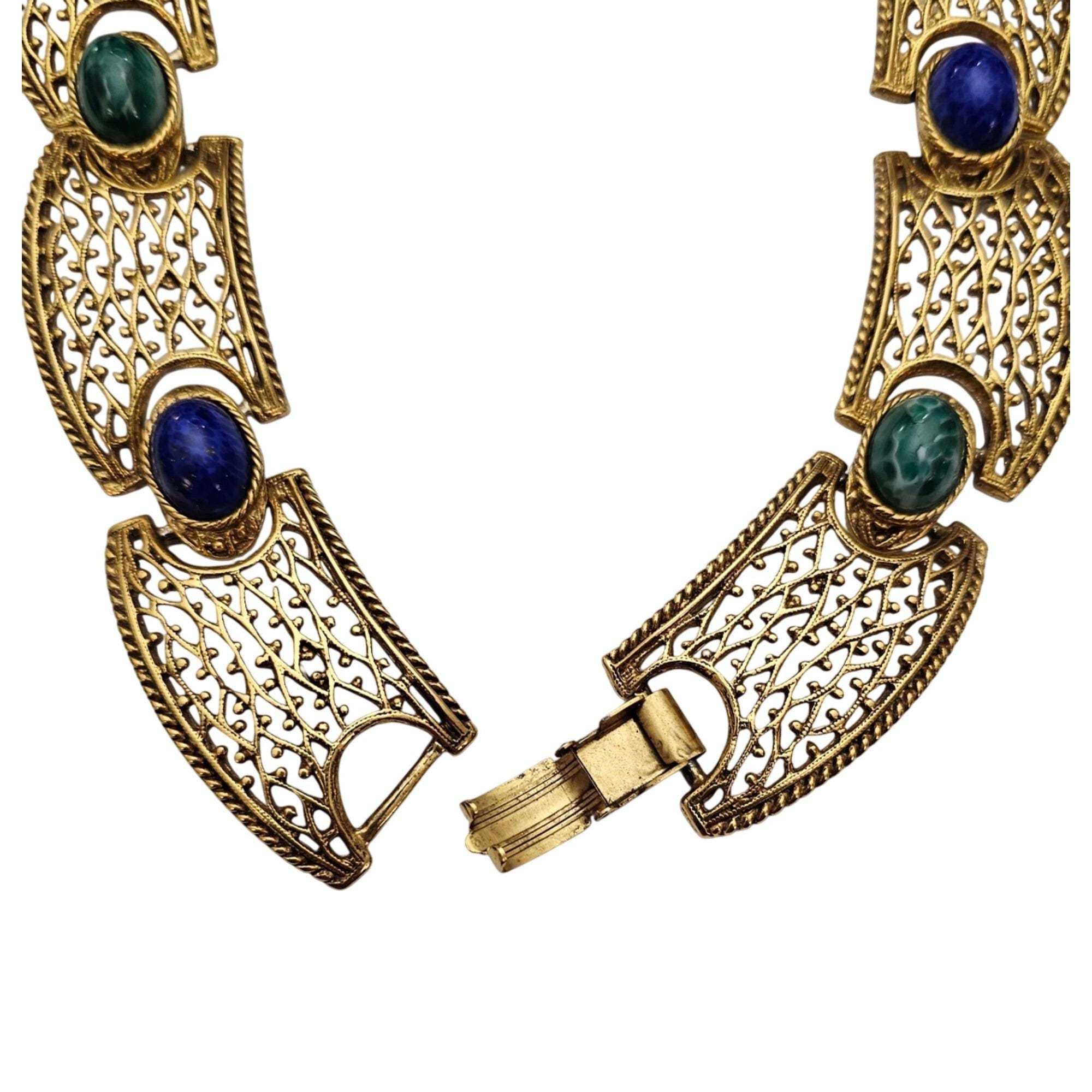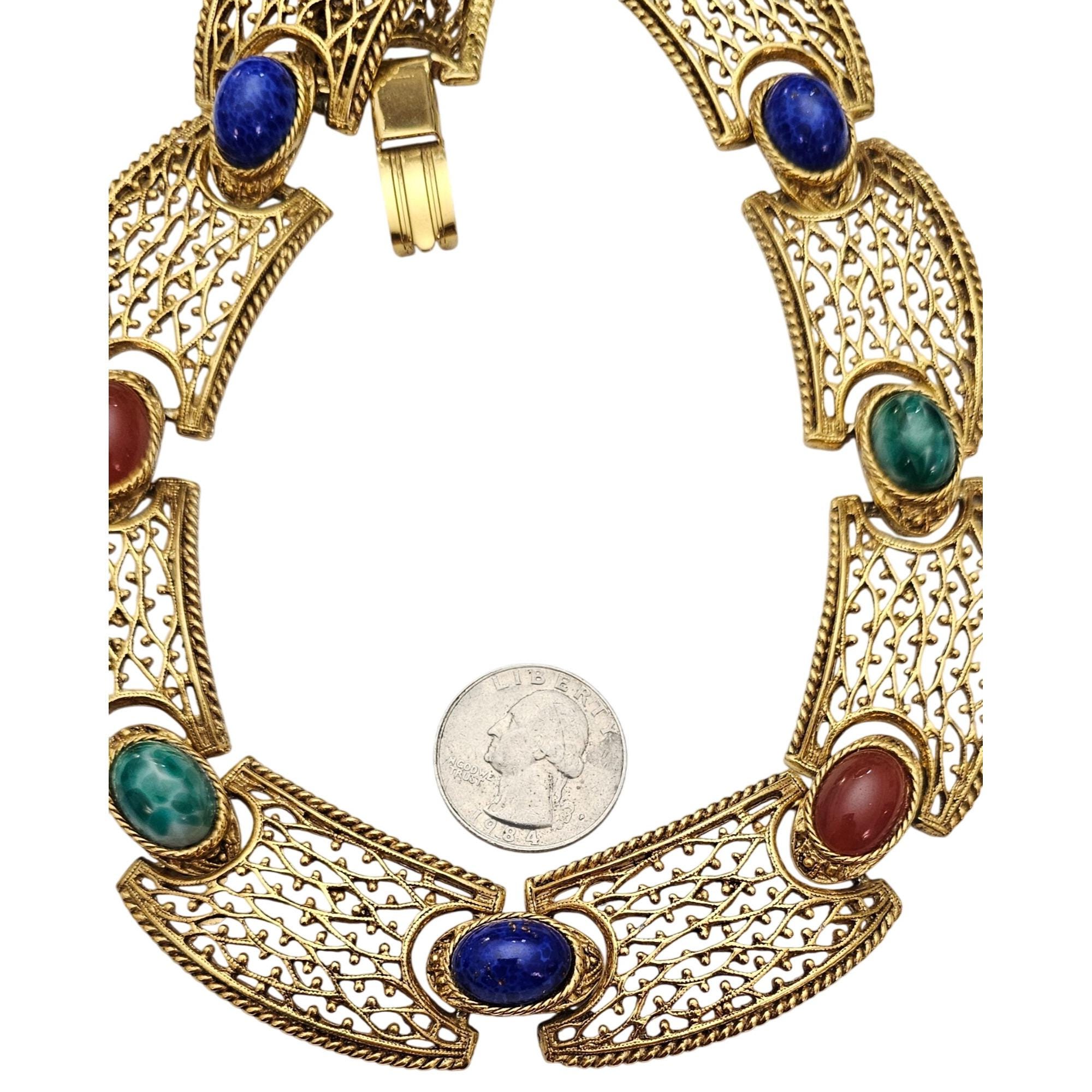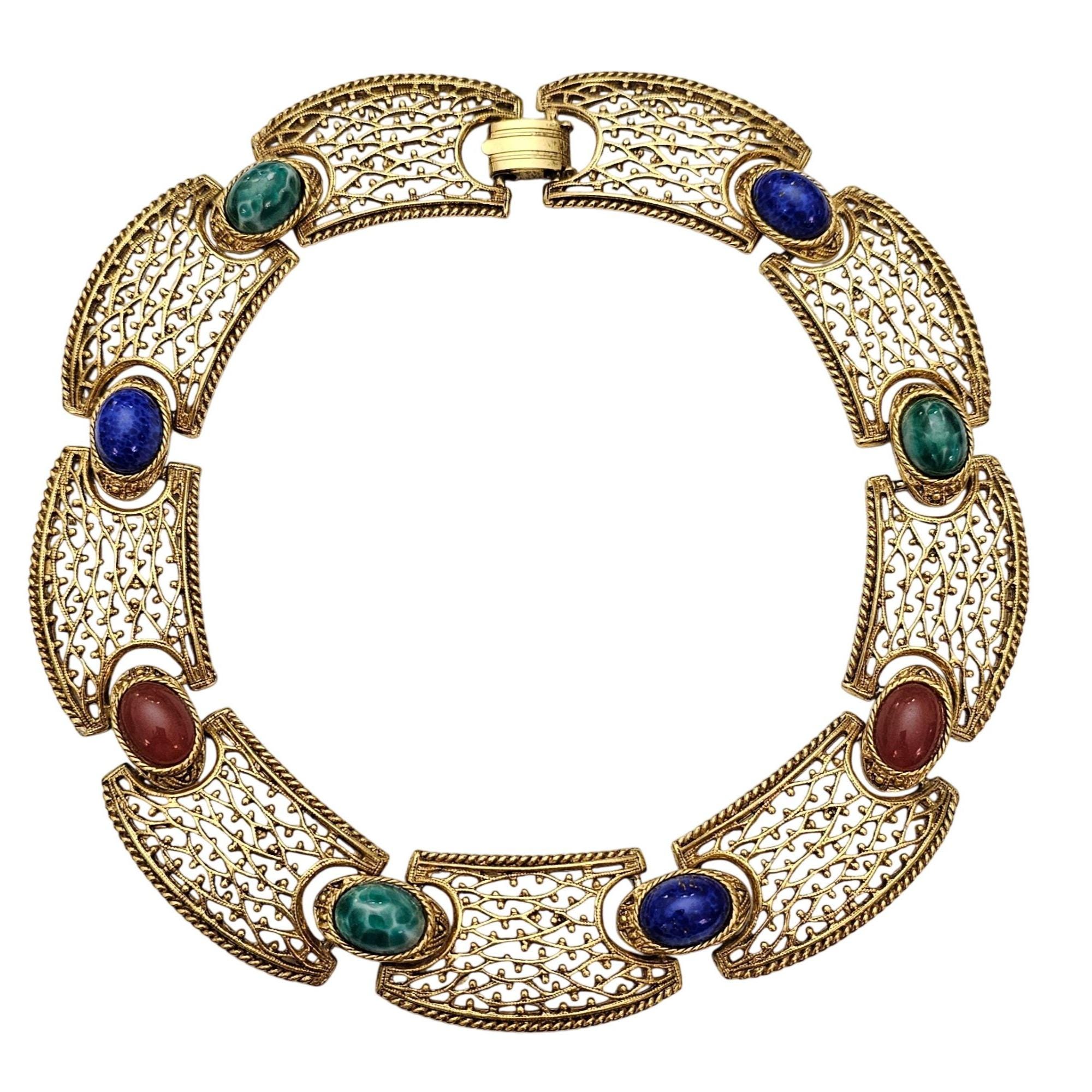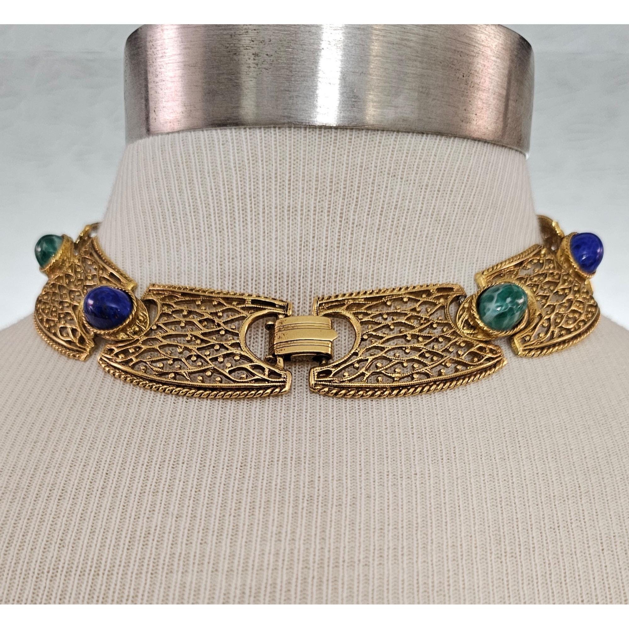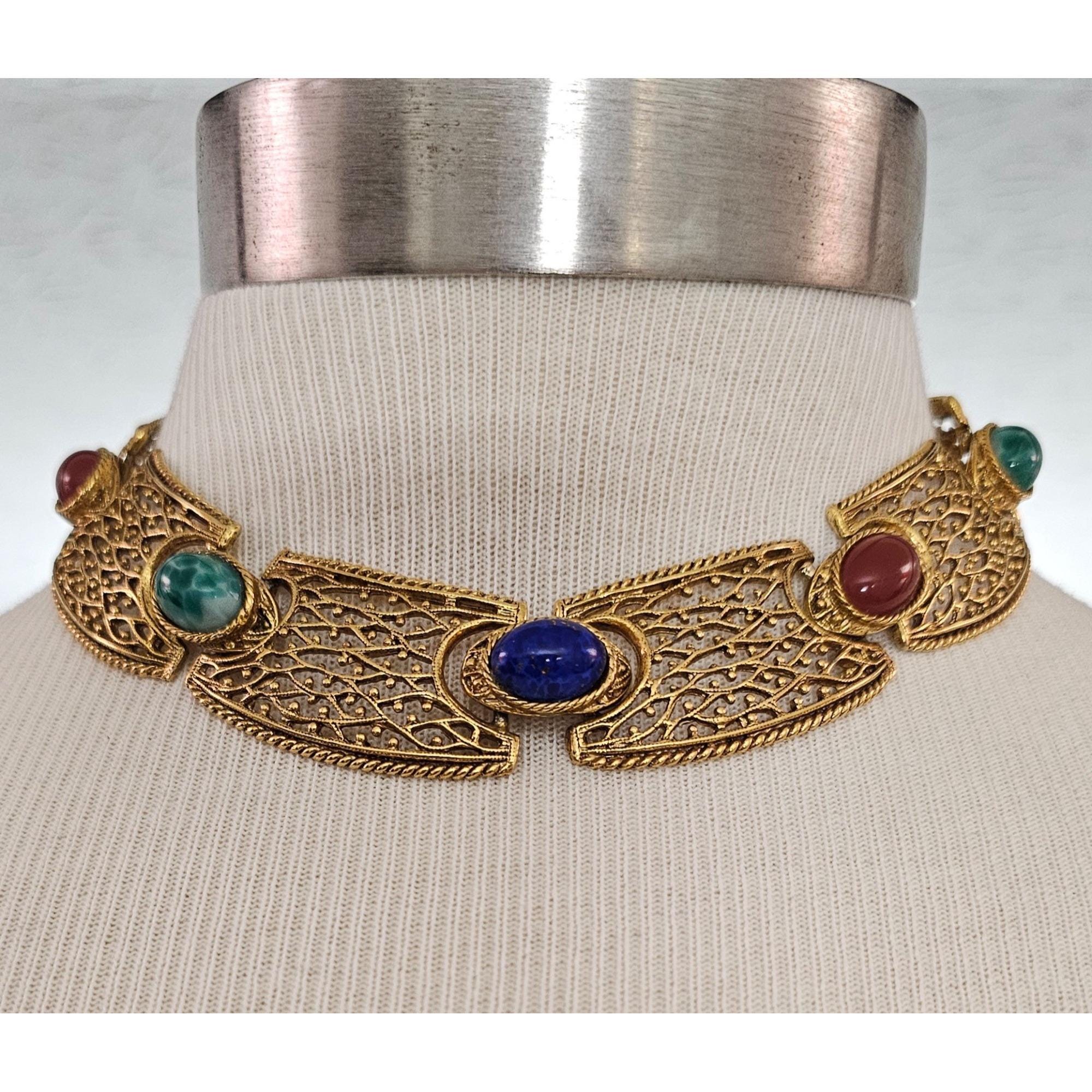 Egyptian Revival Oval Art Glass Cabochon Filigree Choker, Designer Style Necklace J600