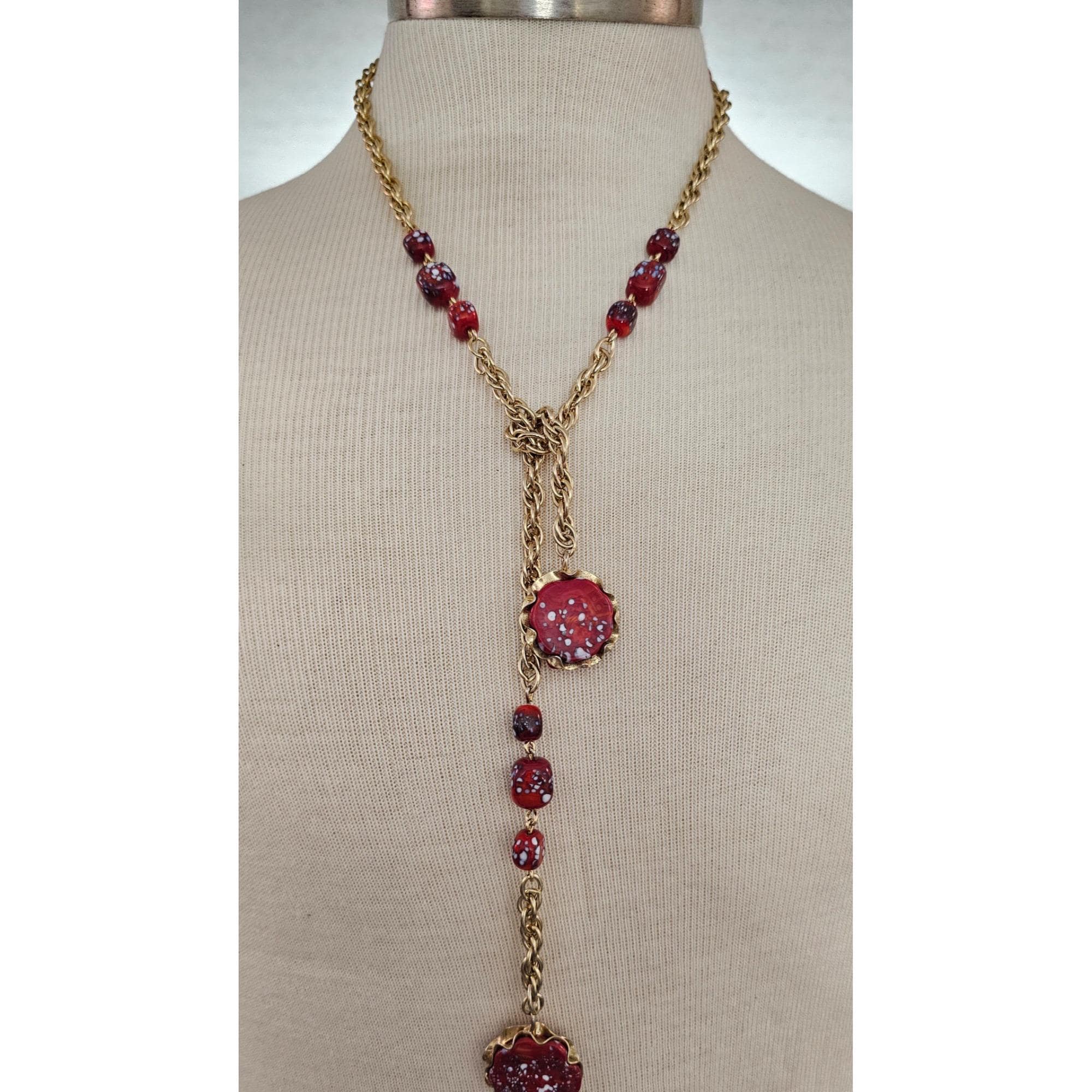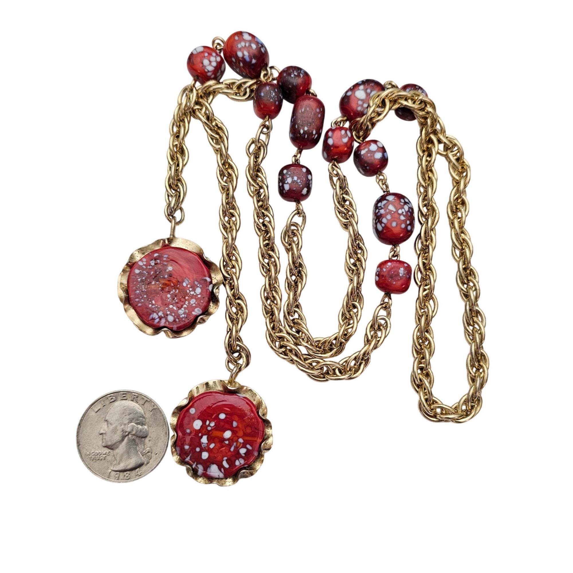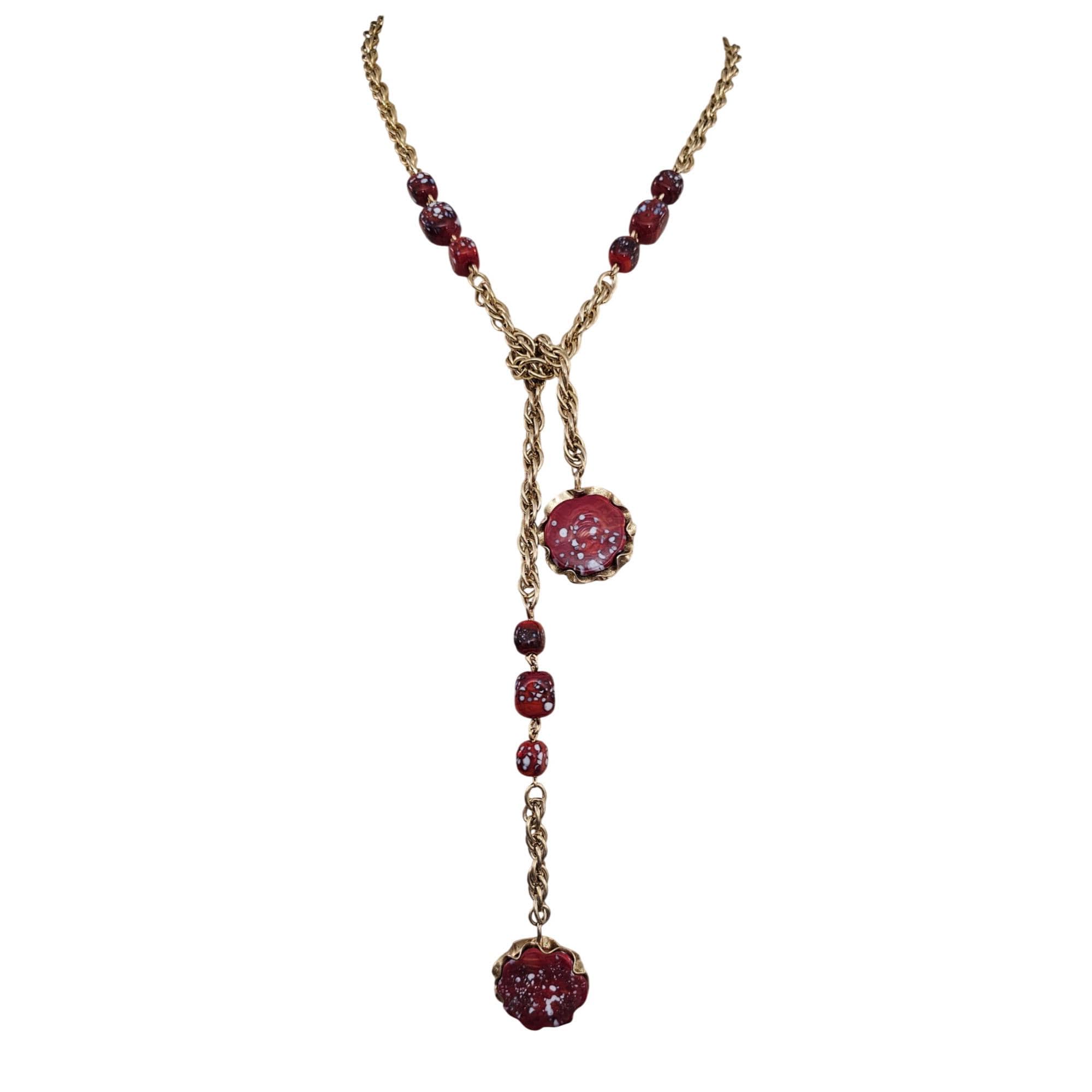 Julio Marcella Marner Art Glass Lariat Necklace Rare Red White Sparkles J583