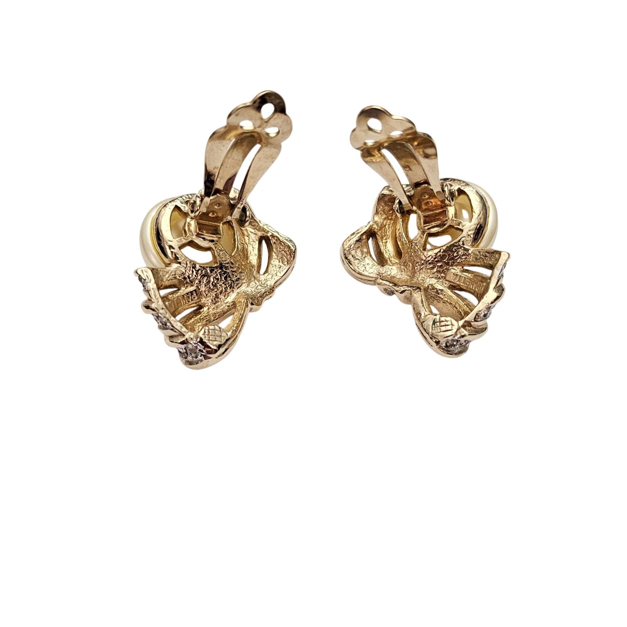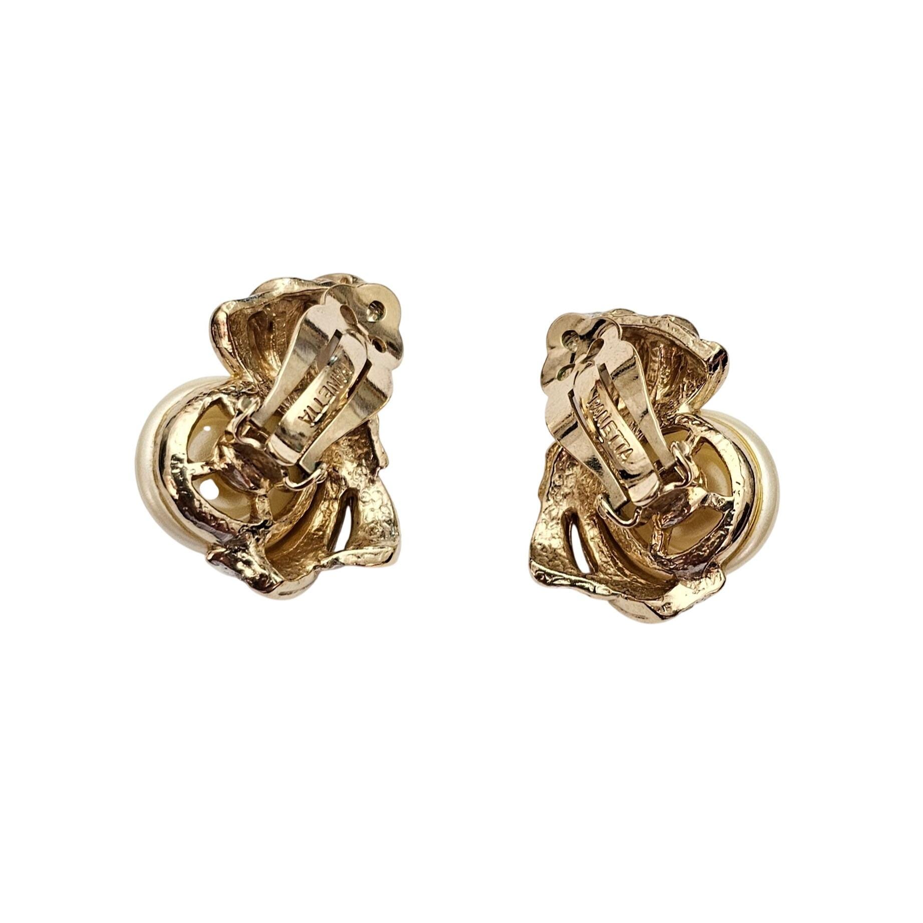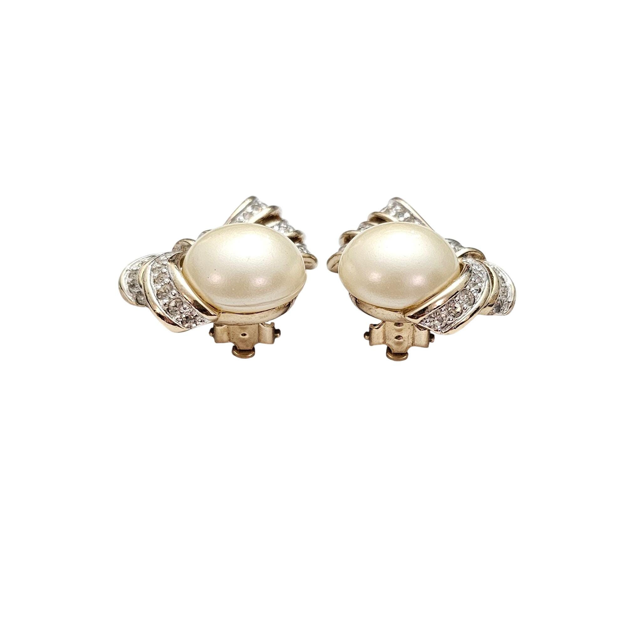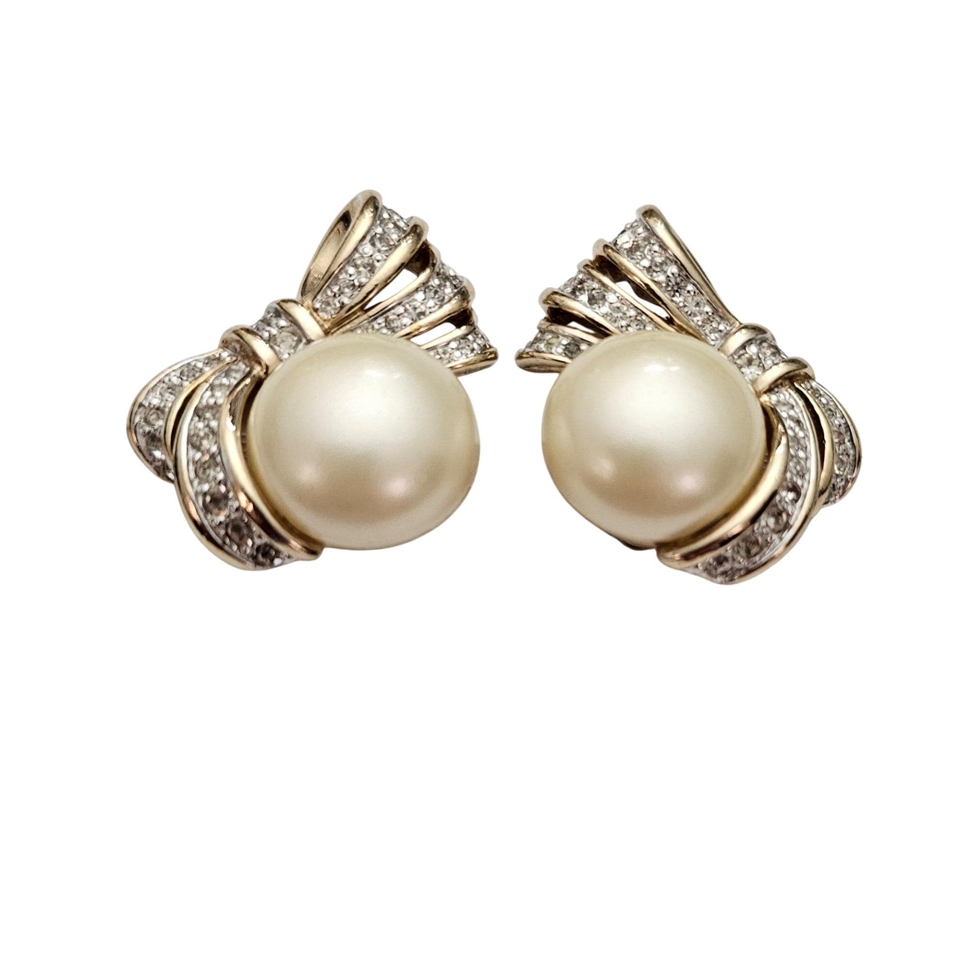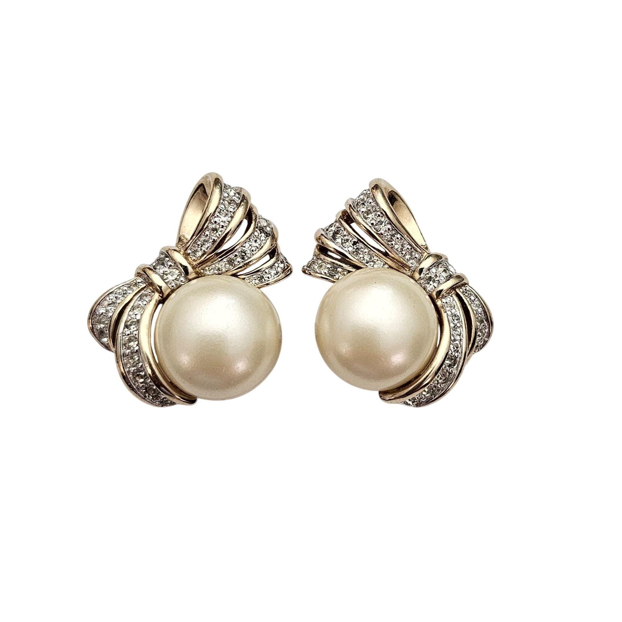 Panetta Clip-On Faux Pearl Clear Rhinestone Bow Earrings Signed, J587