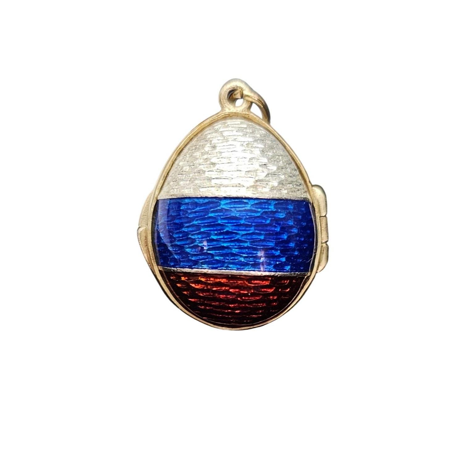 • White Blue Red Guilloche Enamel Egg Locket Pendant