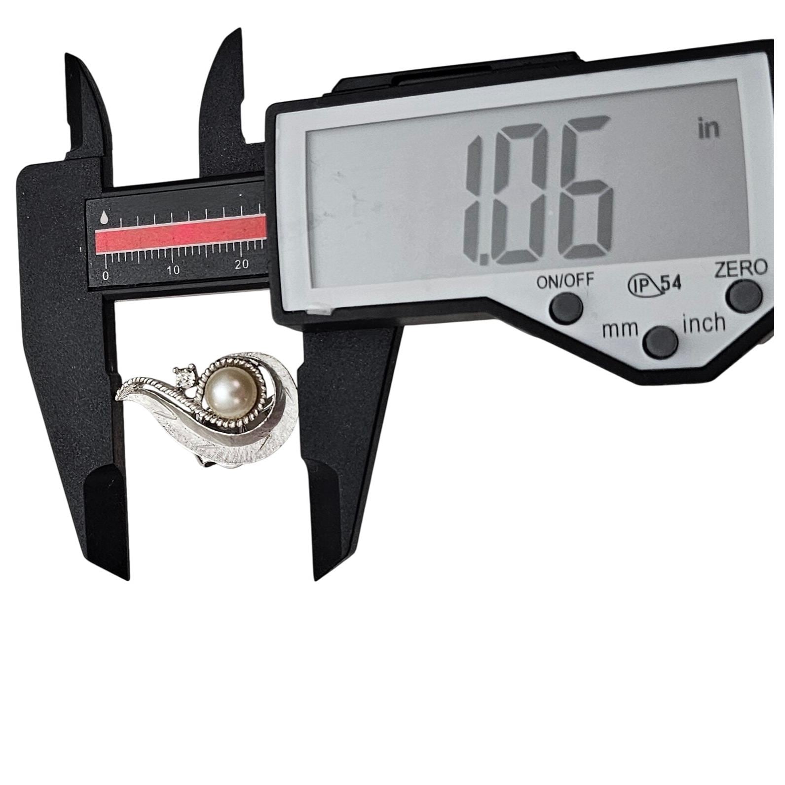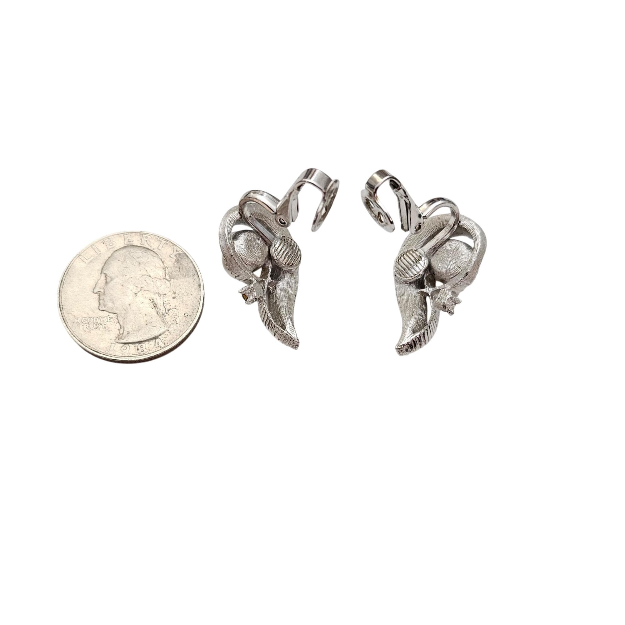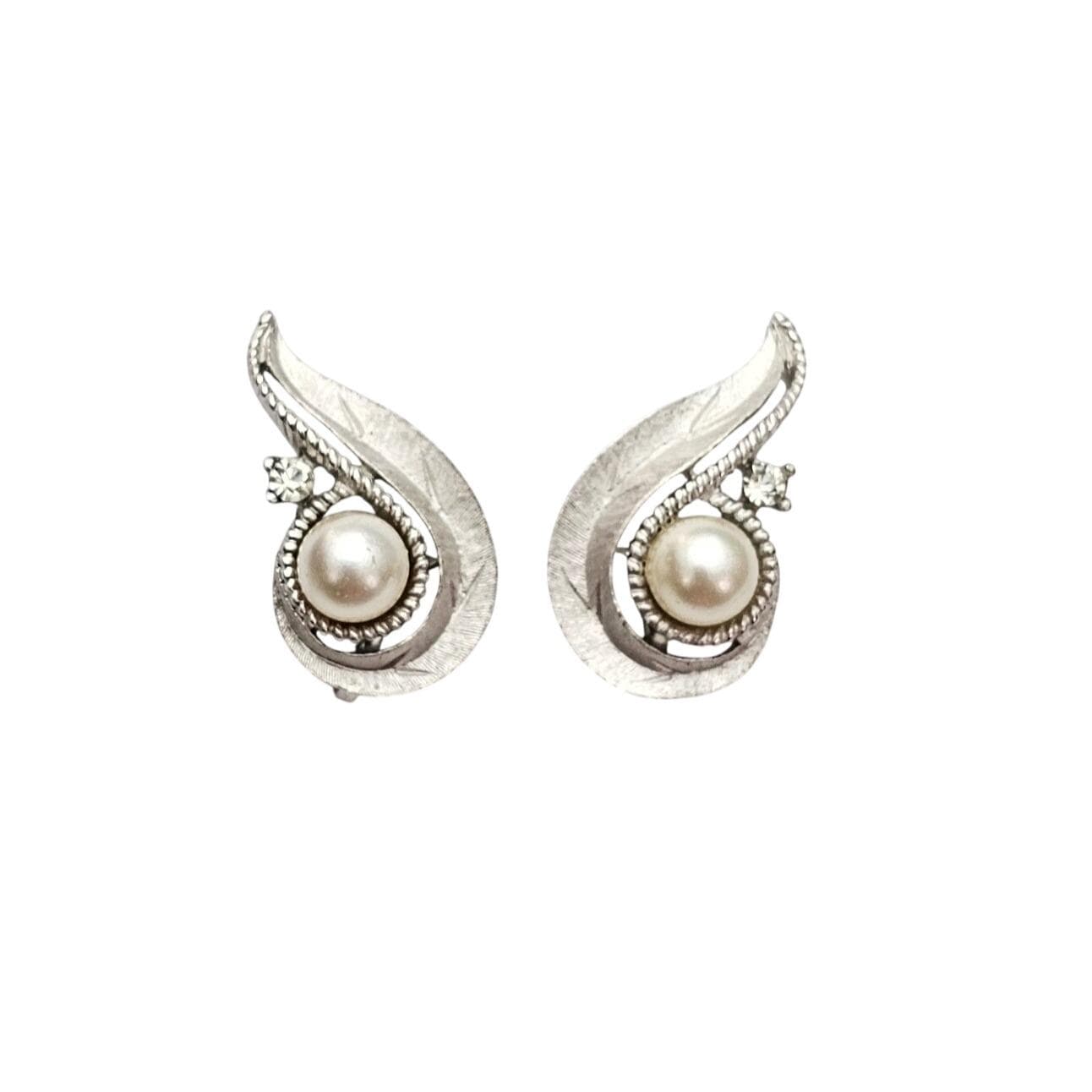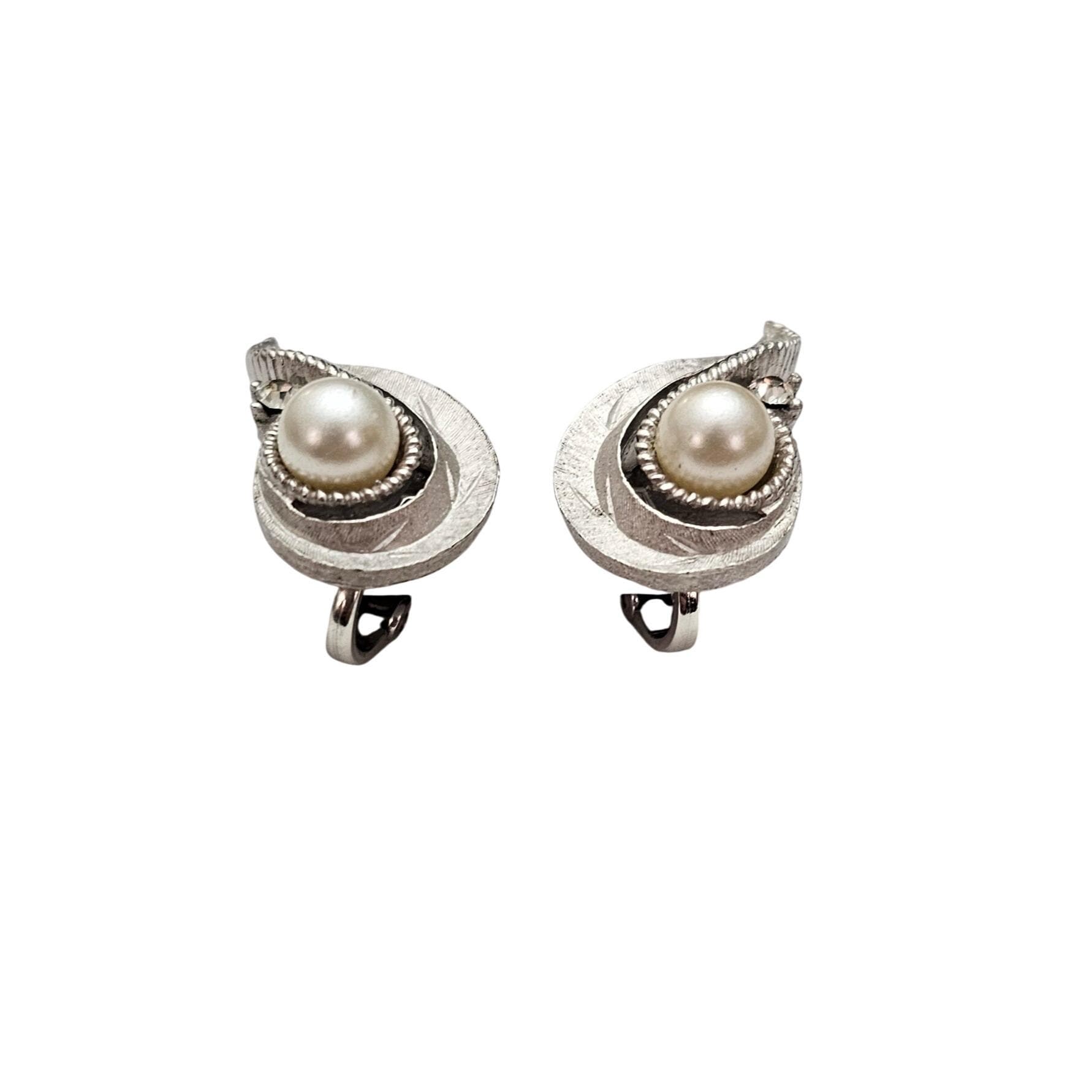 Trifari Crown Over T Clip On Faux Pearl Silver Tone Earrings Clear Rhinestone Signed, J611