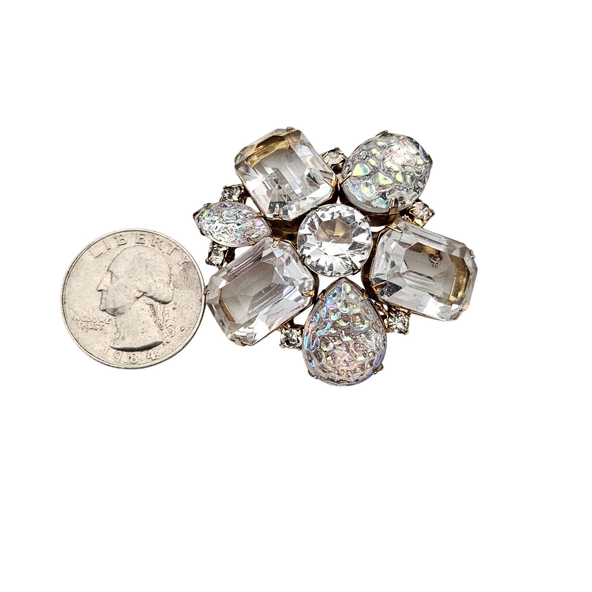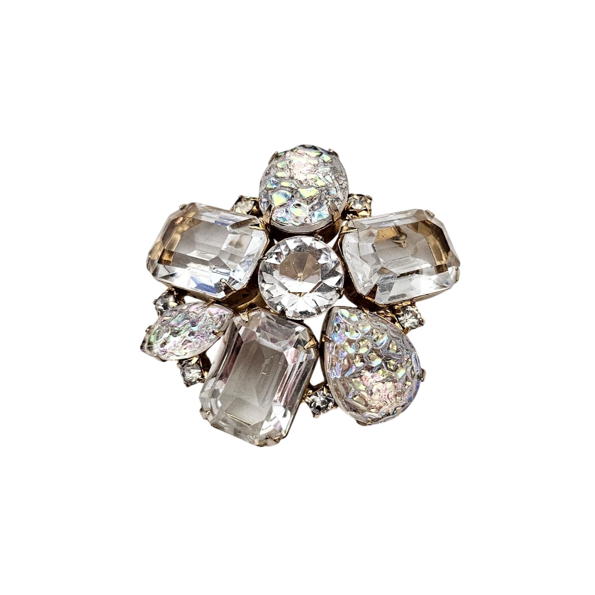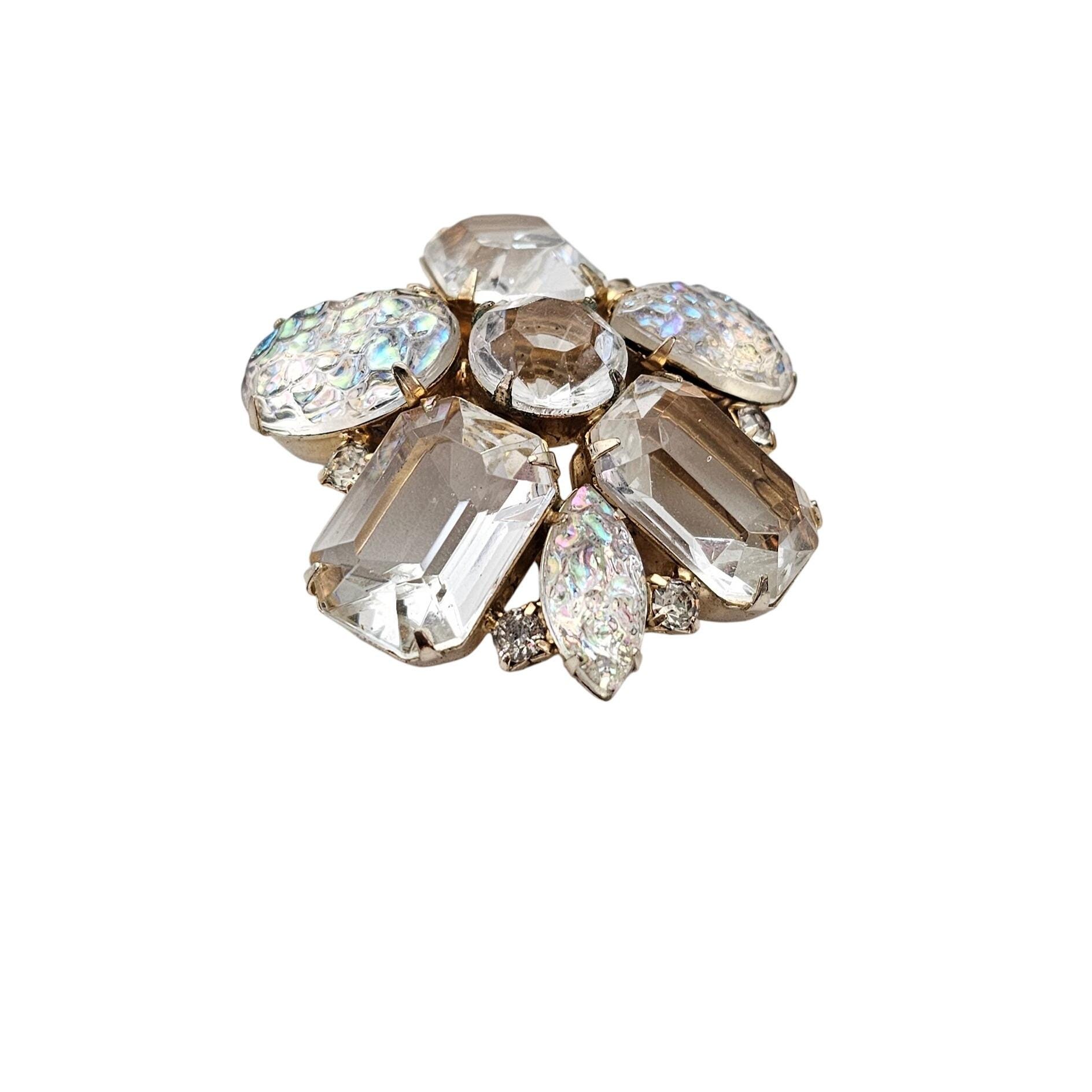 Clear Open Back Emerald Cut Rhinestone Cluster Brooch Lava AB Pin J610