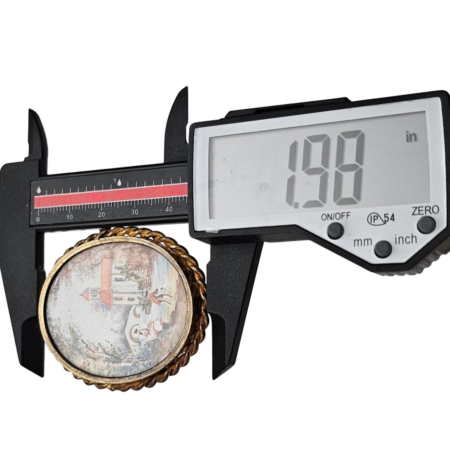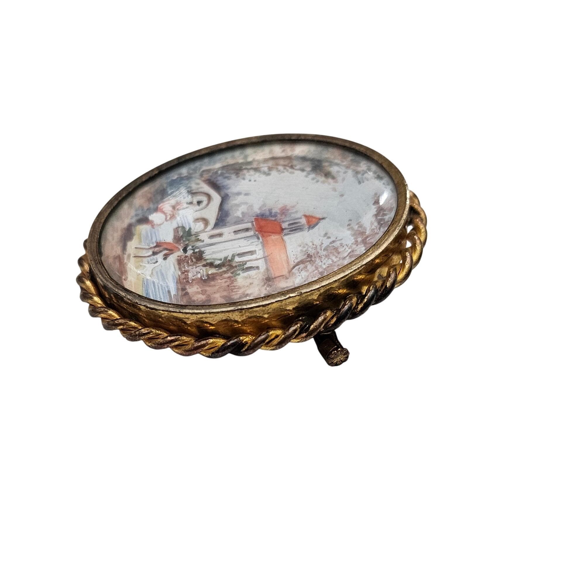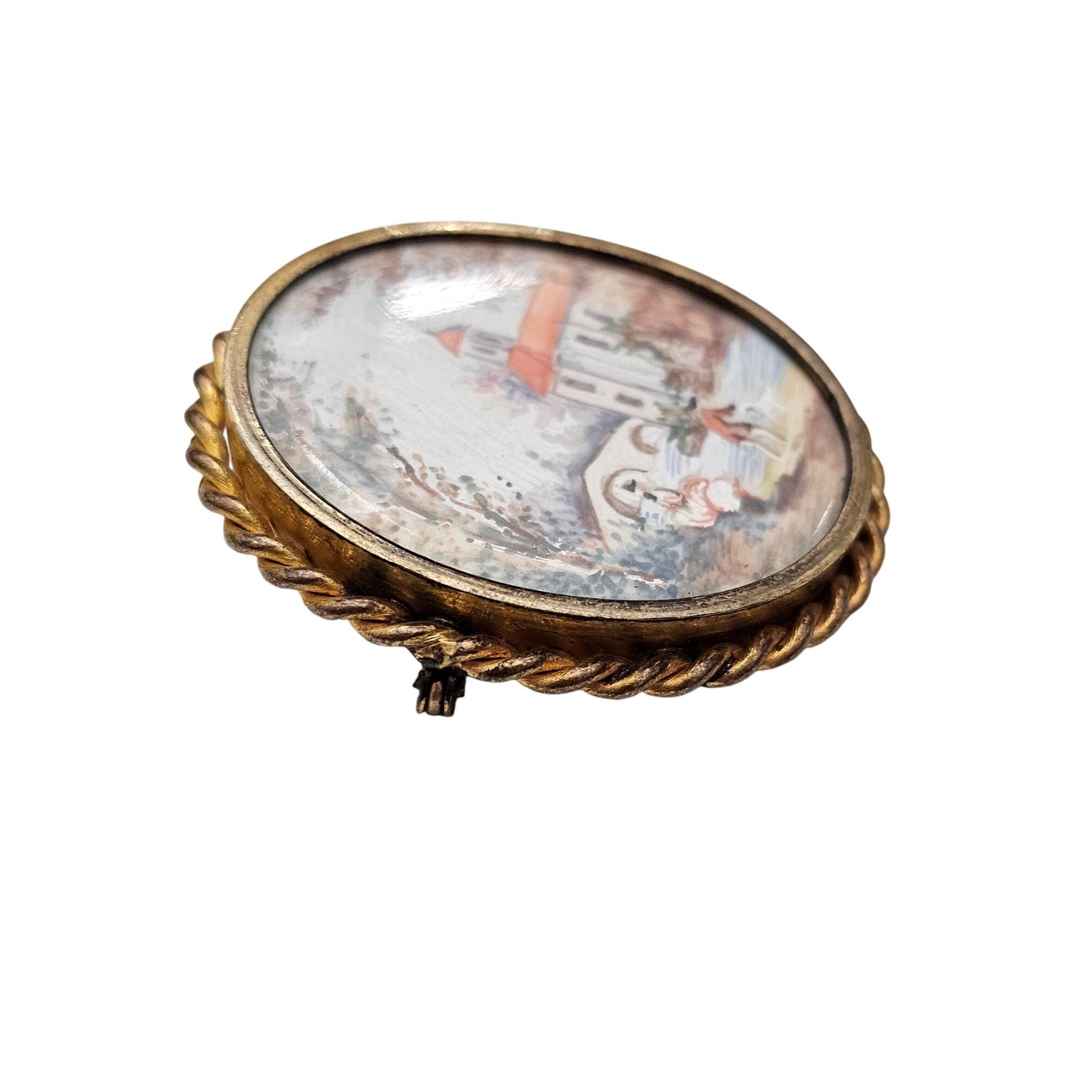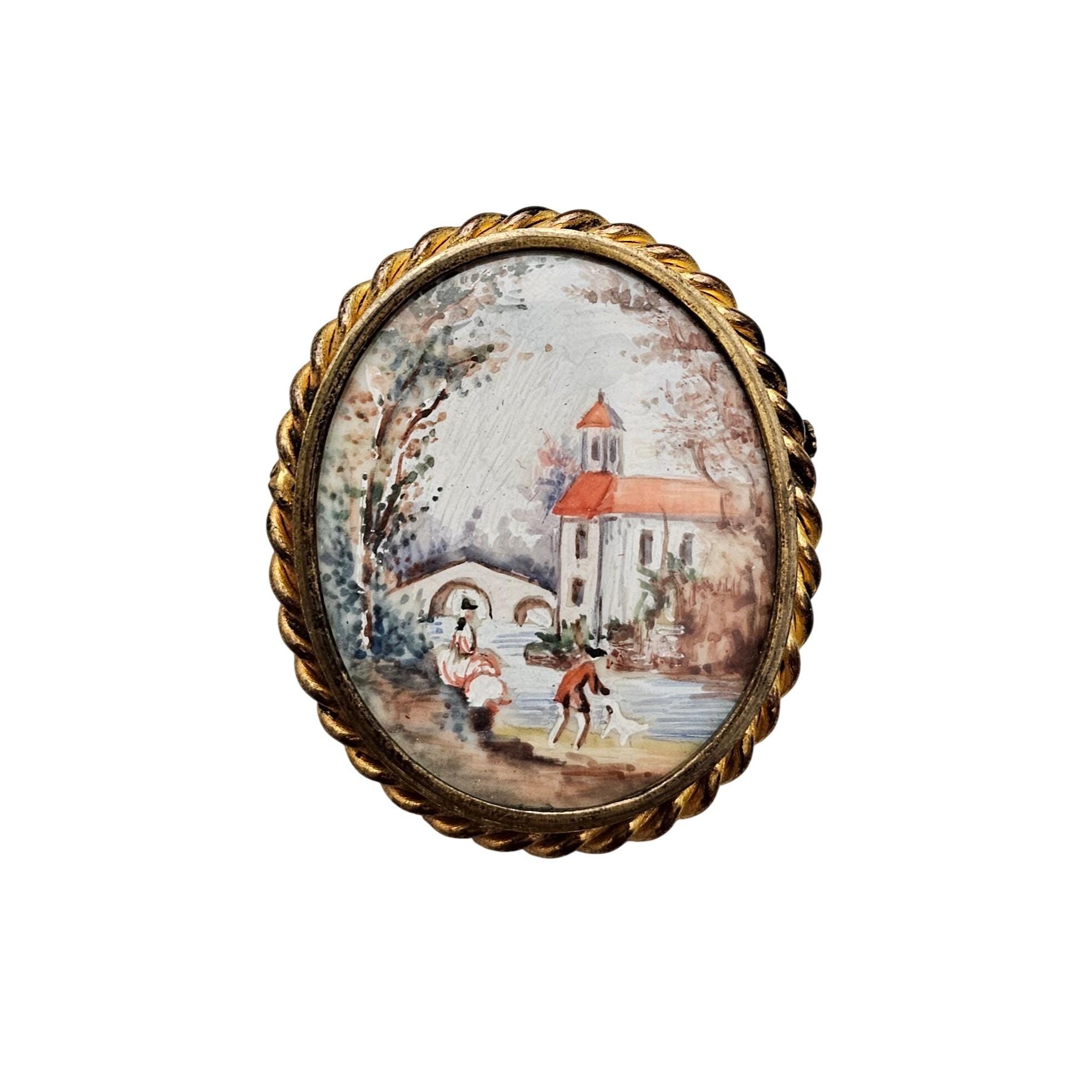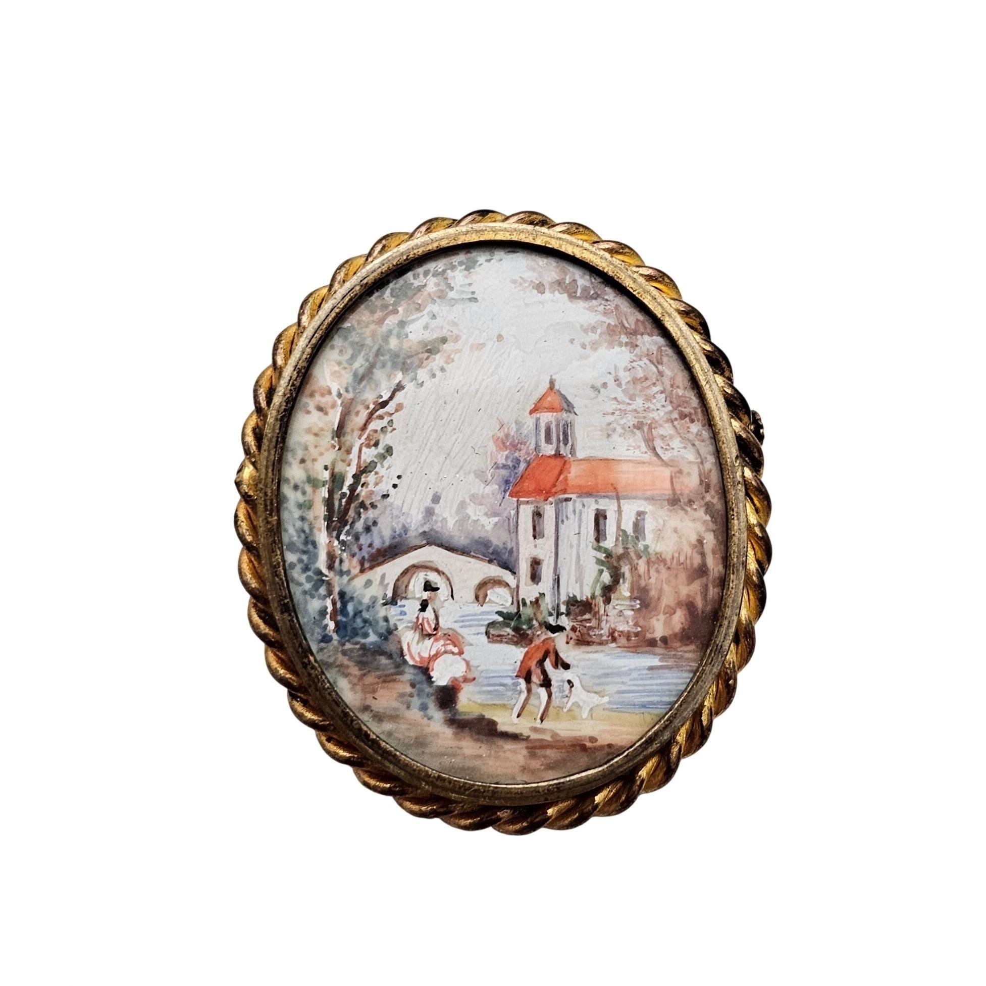 Hand Painted Pastoral Scene Oval Brooch Trombone Clasp J618