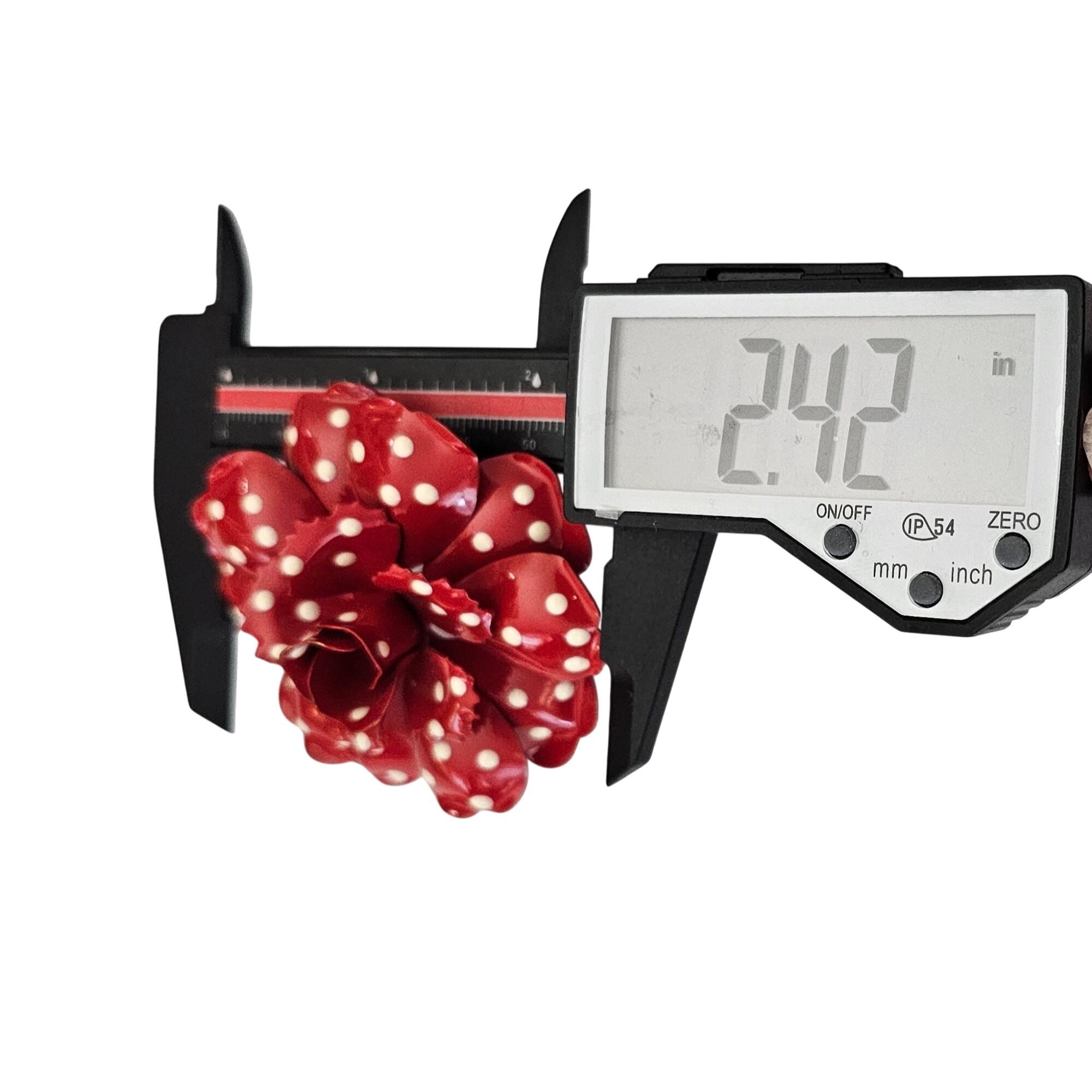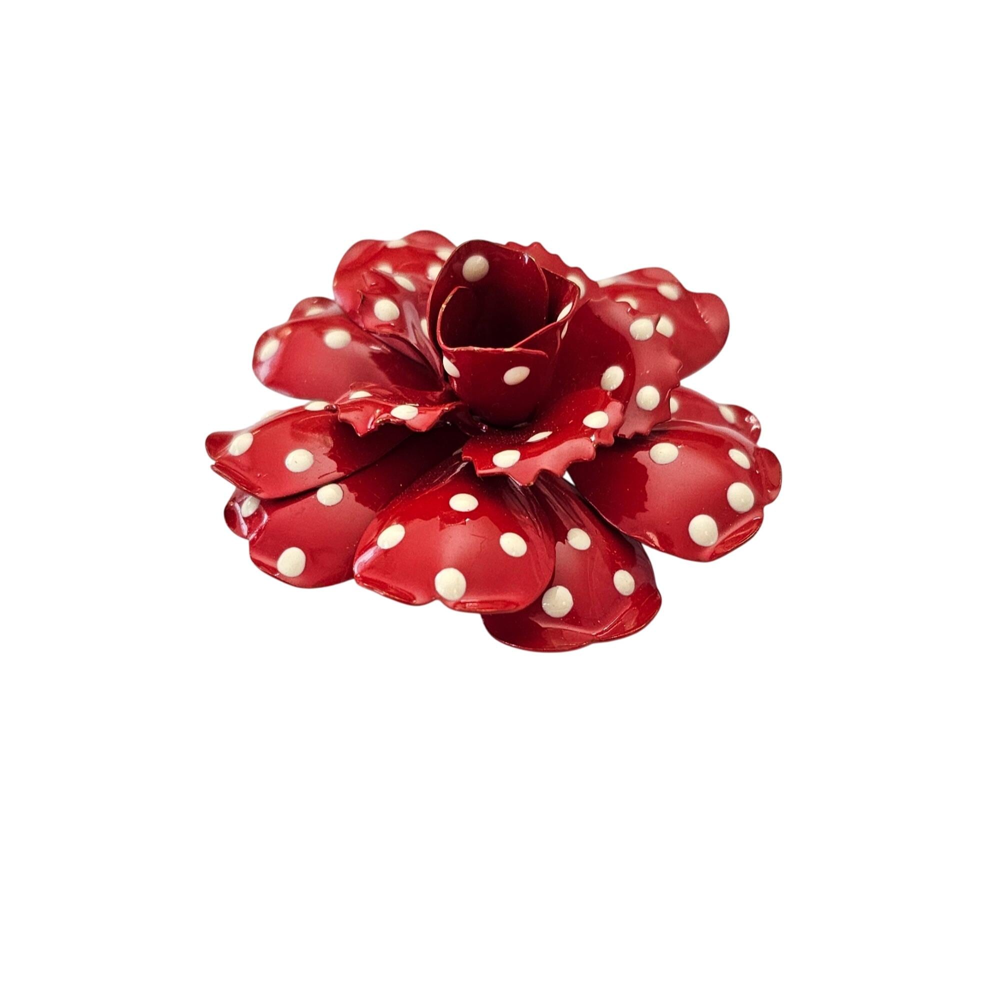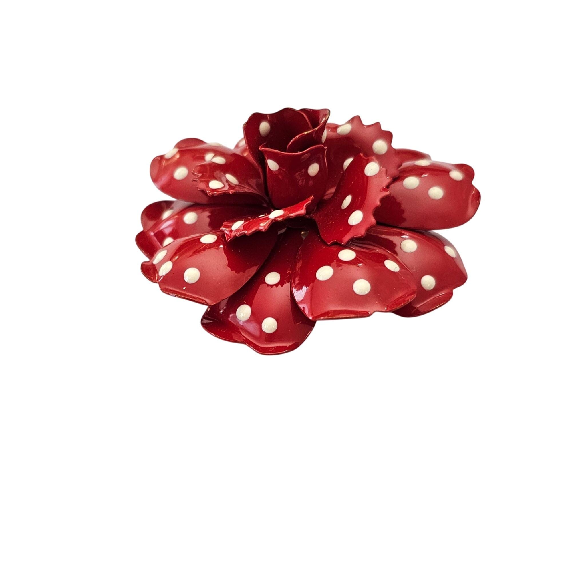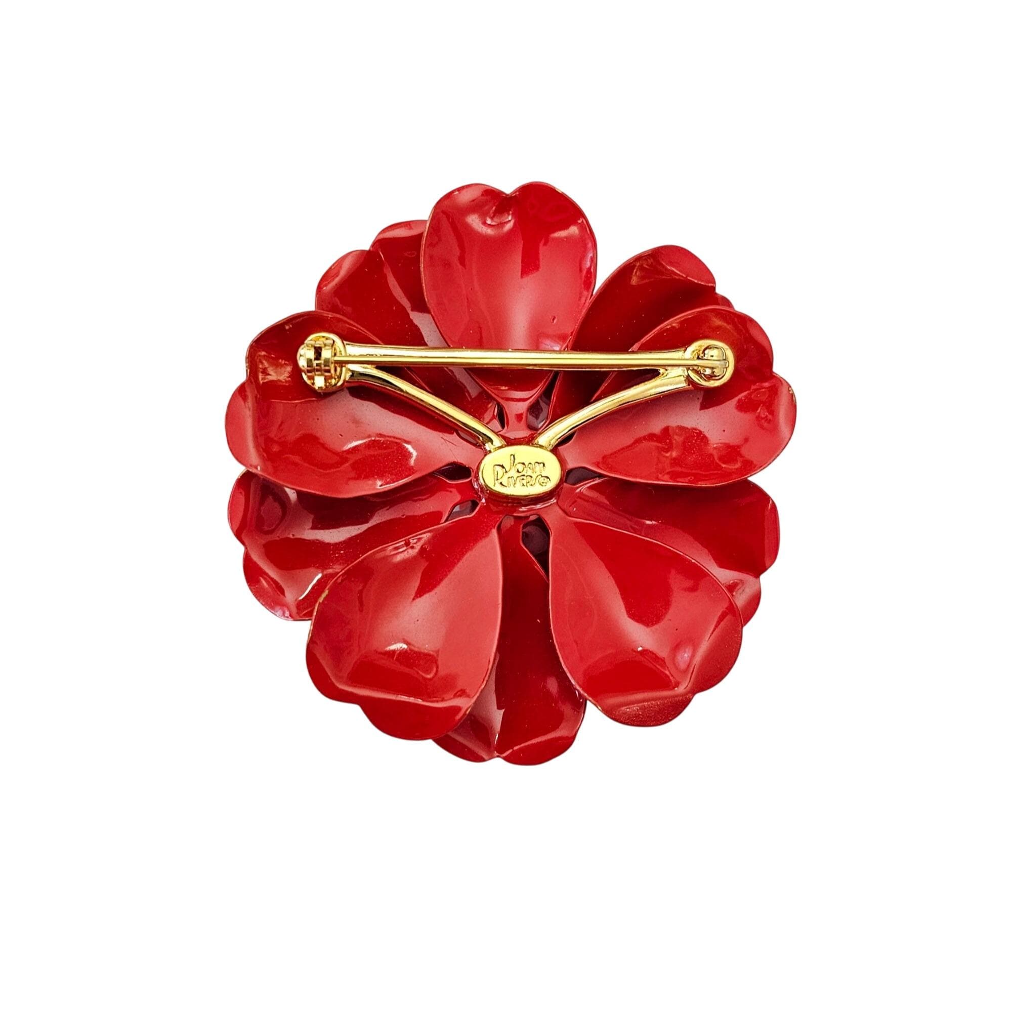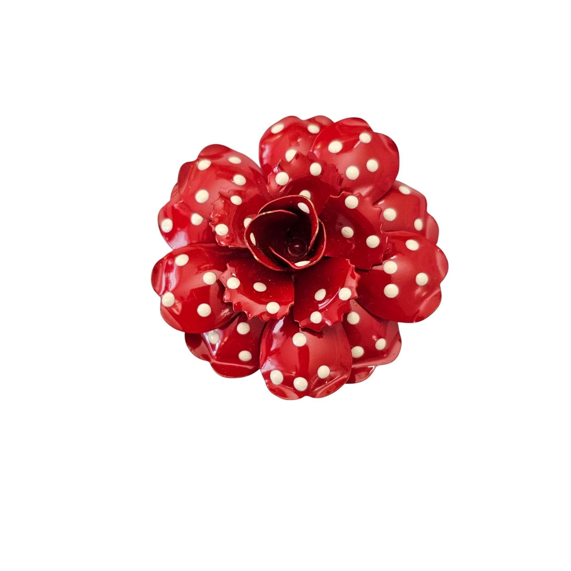 Joan Rivers Red Metal Flower Brooch White Polka Dot Layer Petals Pin Signed, J629