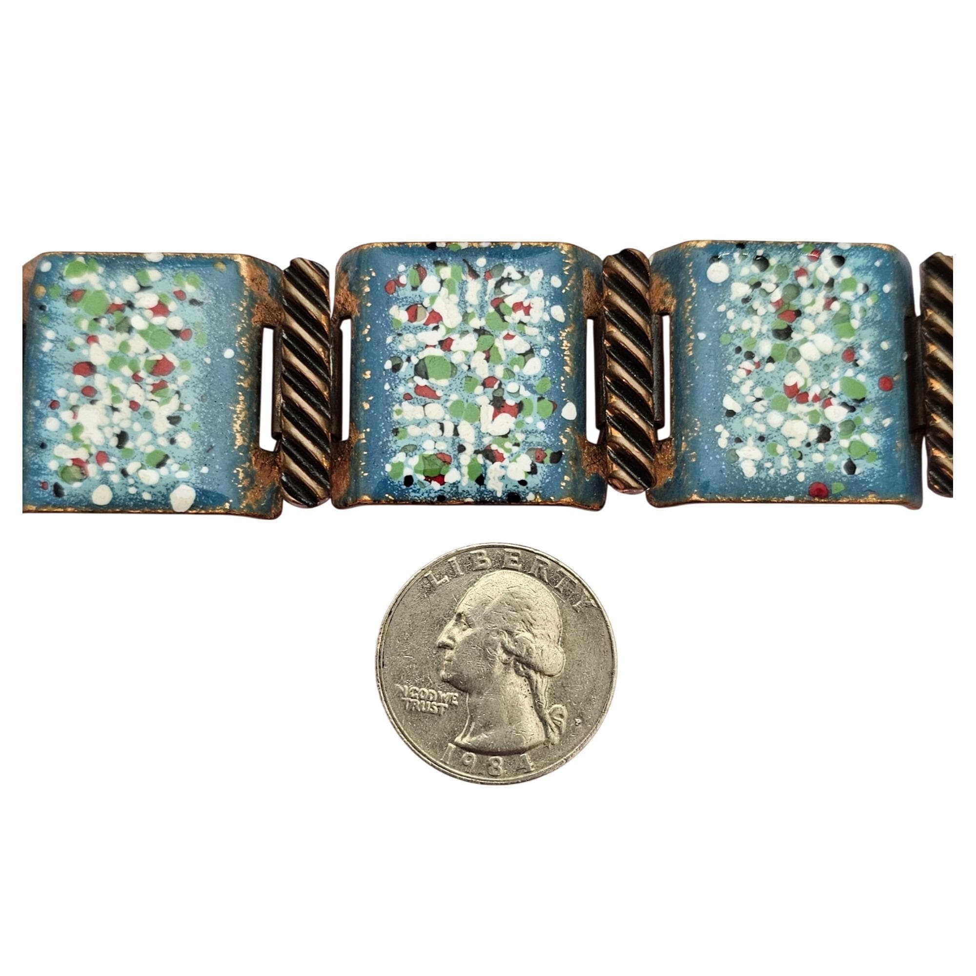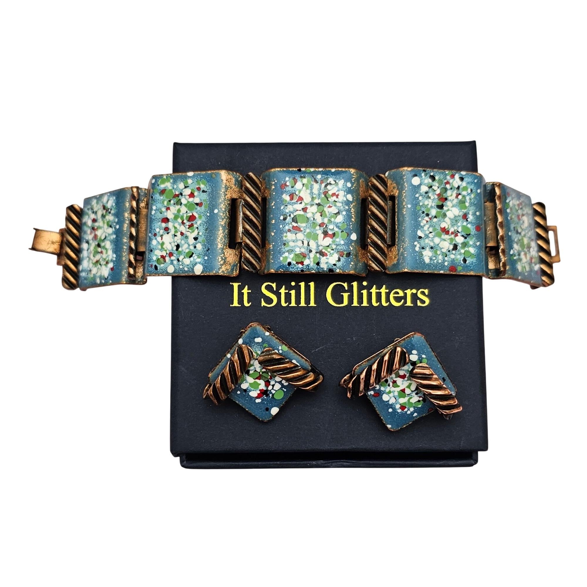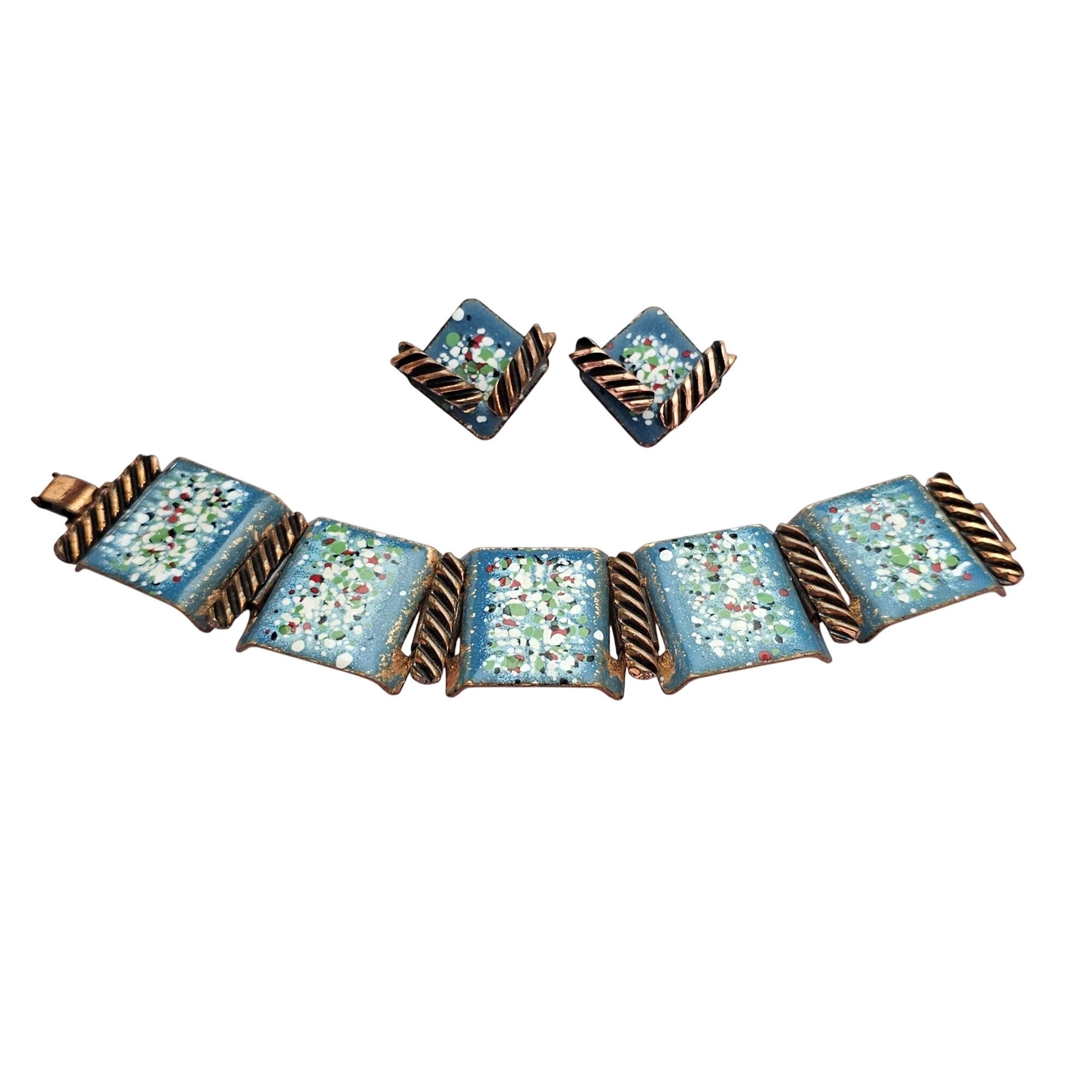 Mattise Renoir Blue Speckled Copper Enamel Panel Bracelet Clip-On Earrings J622