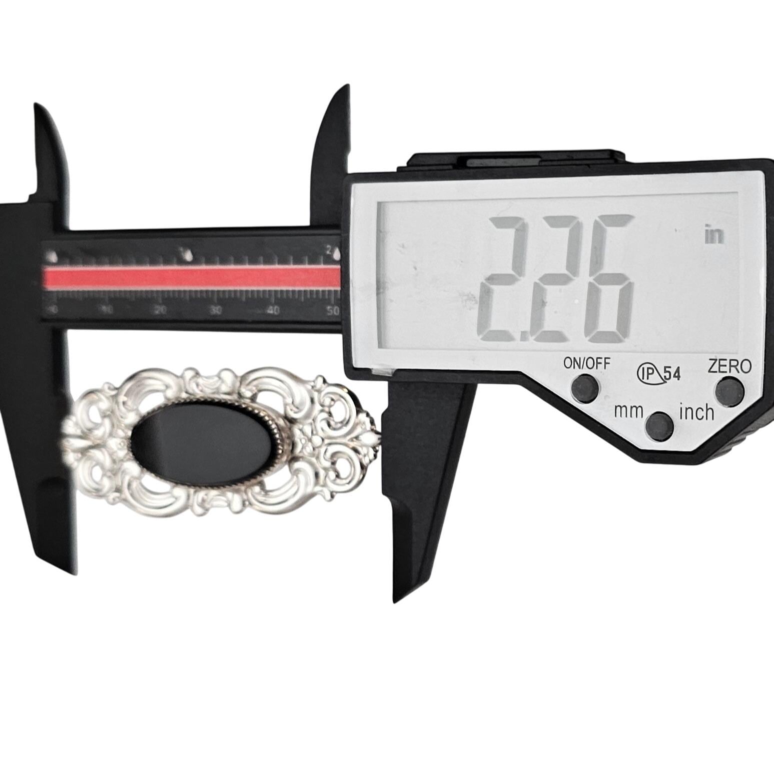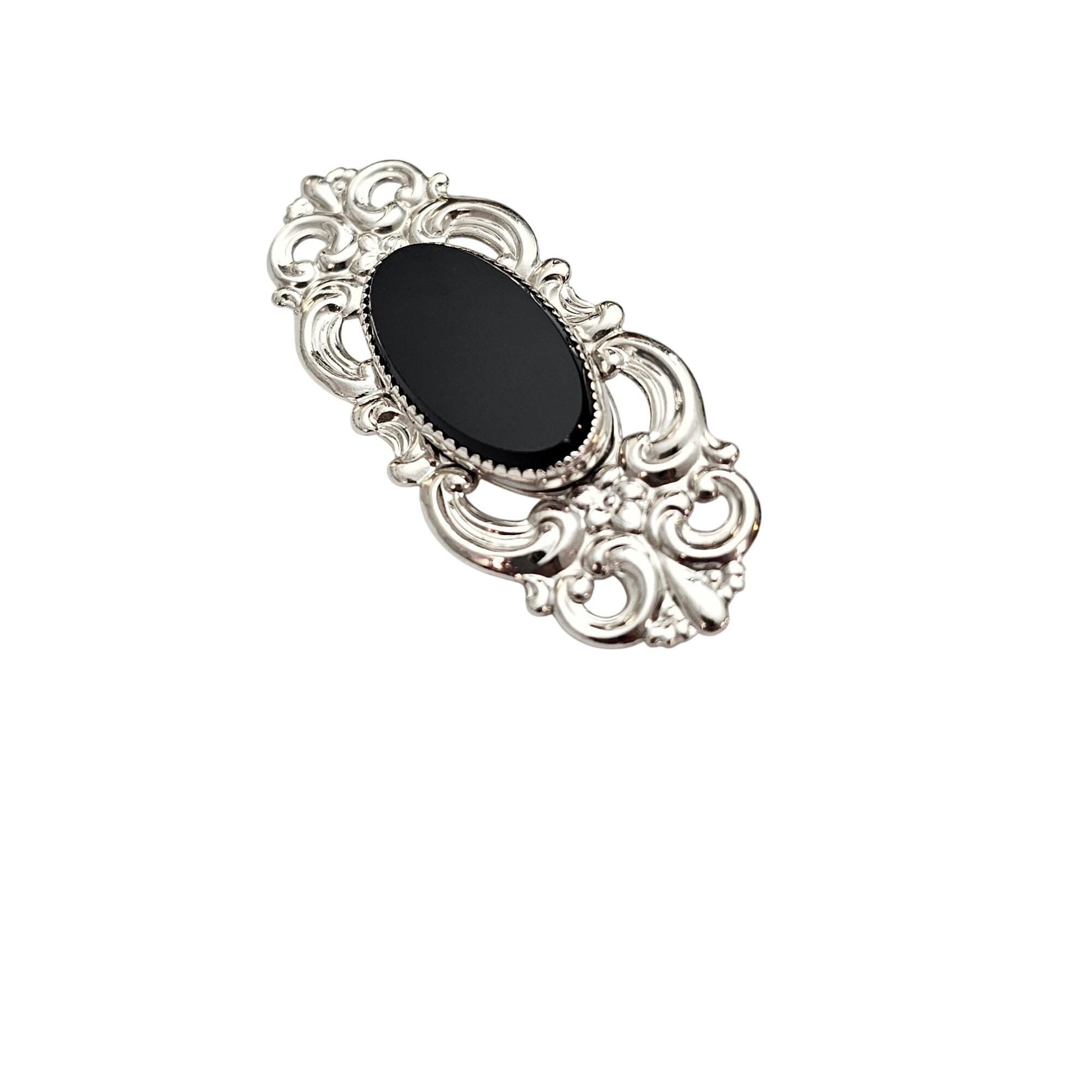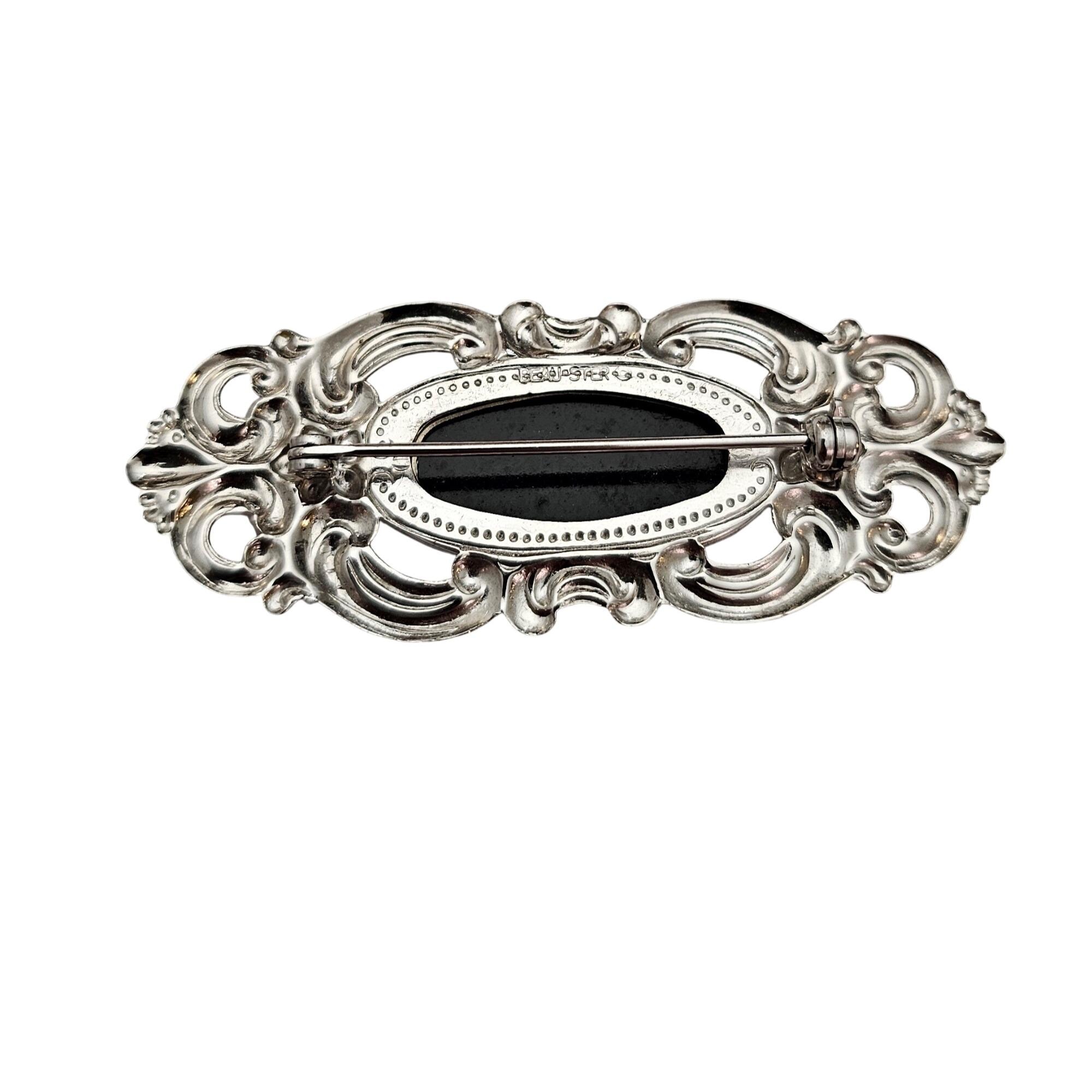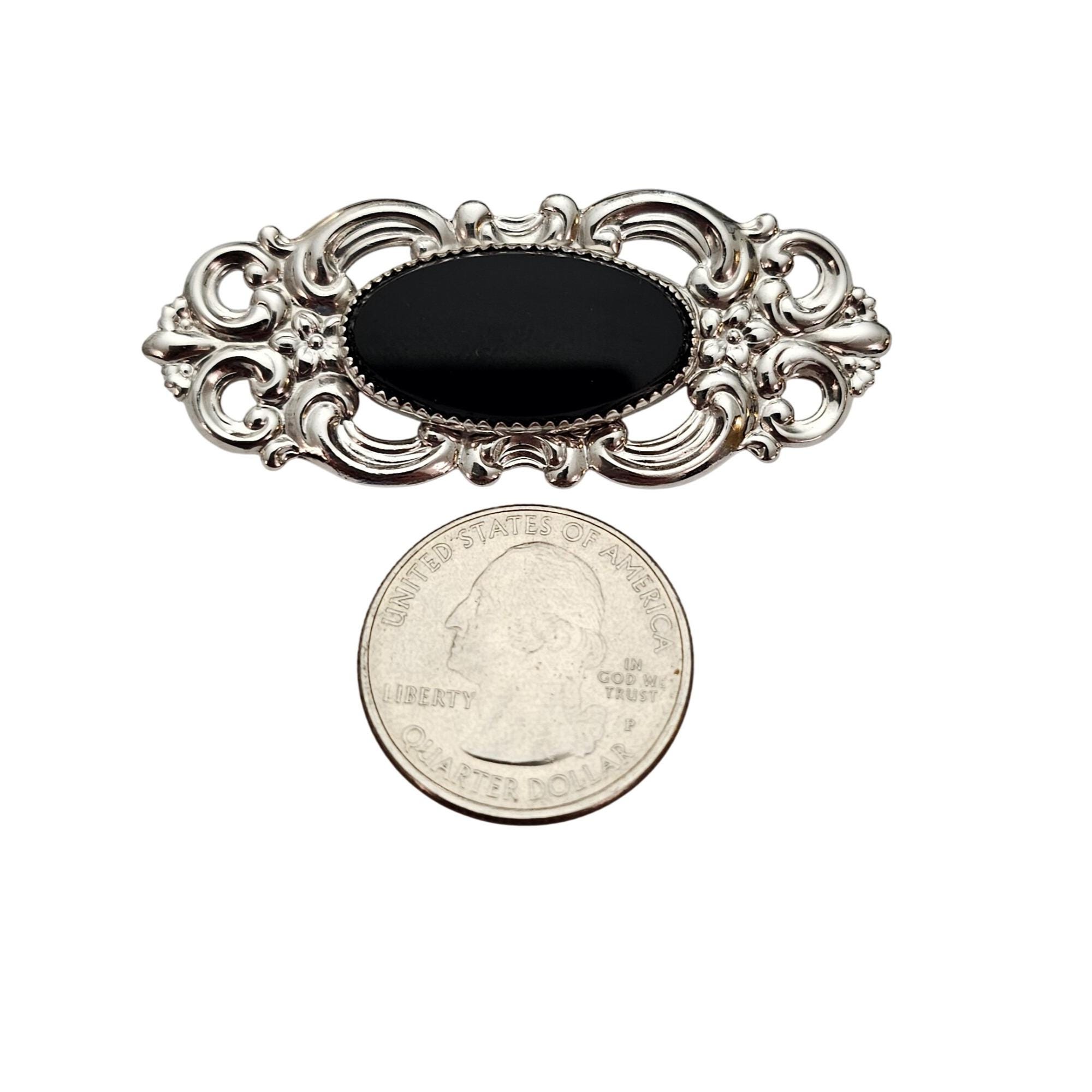 Beau Sterling Silver Oval Fleur Scroll Onyx Brooch Repousse Pin, Signed J654