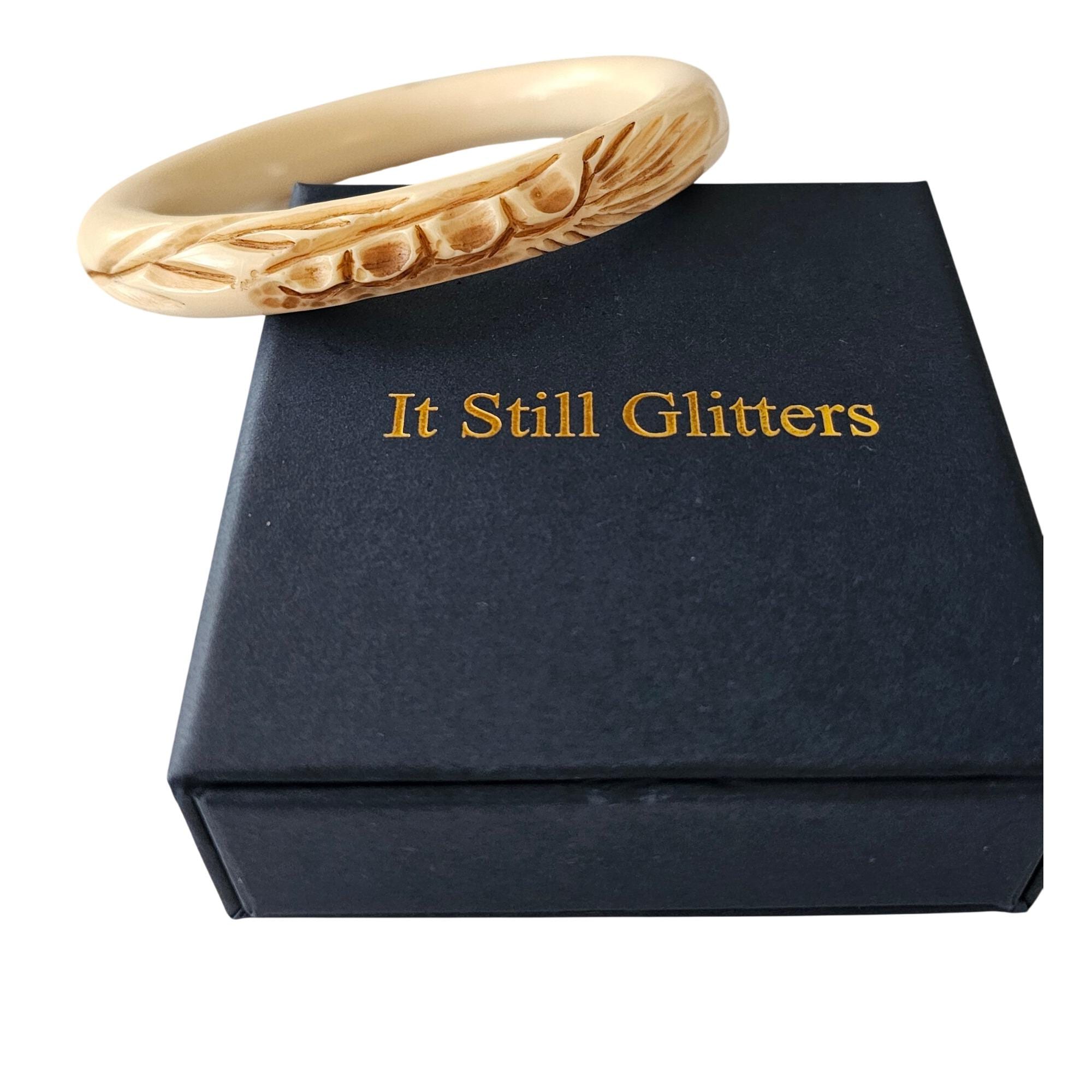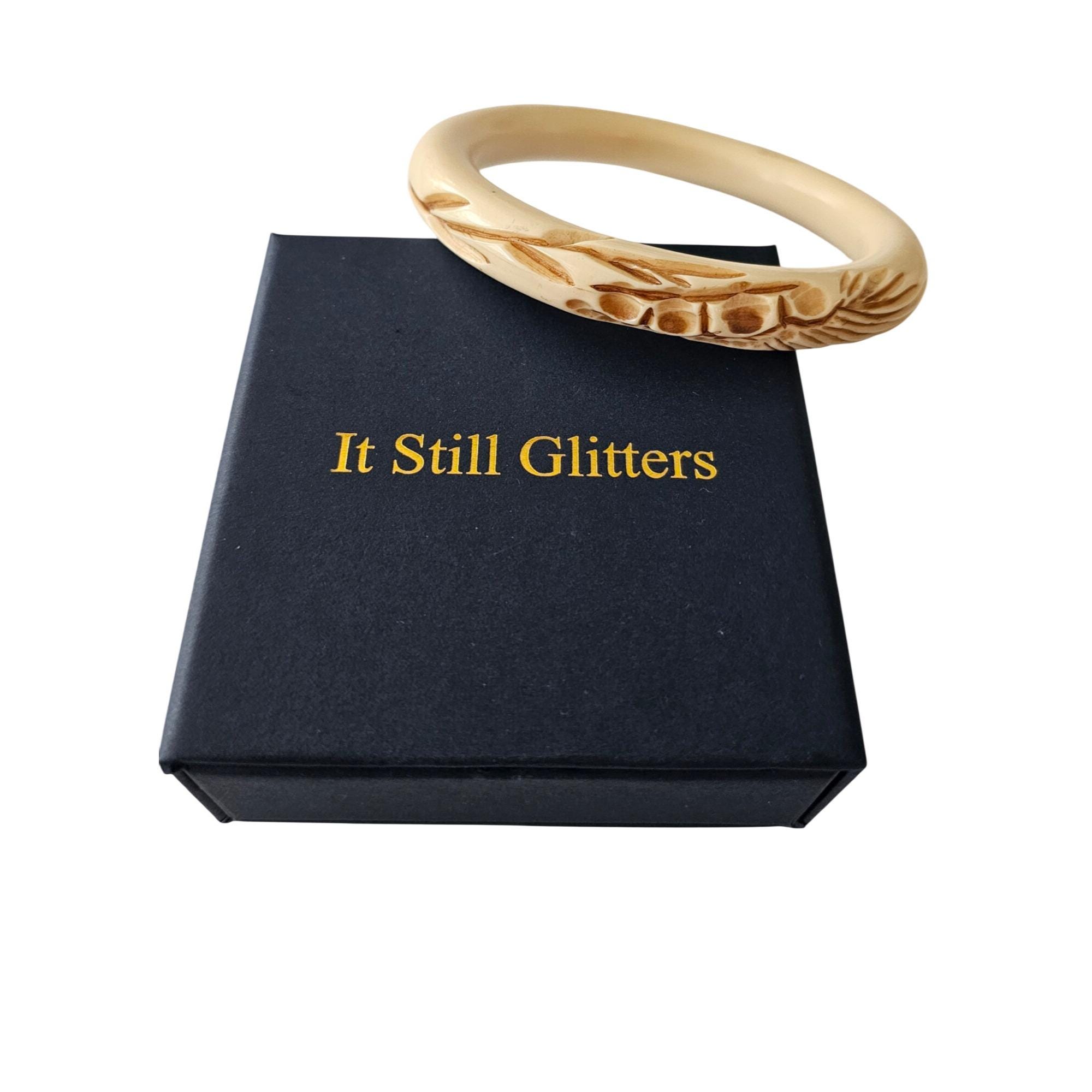 • This delightful bangle measures approximately 0.5 inches in width and 2.6 inches in inner diameter