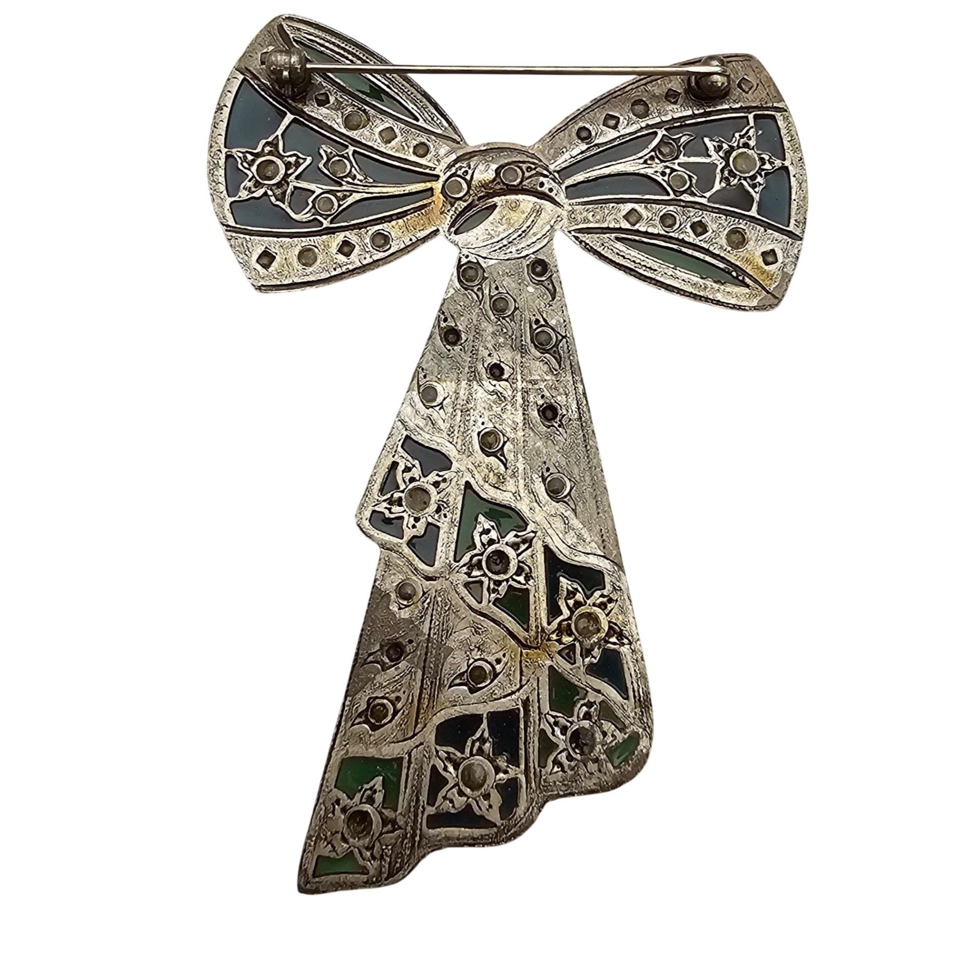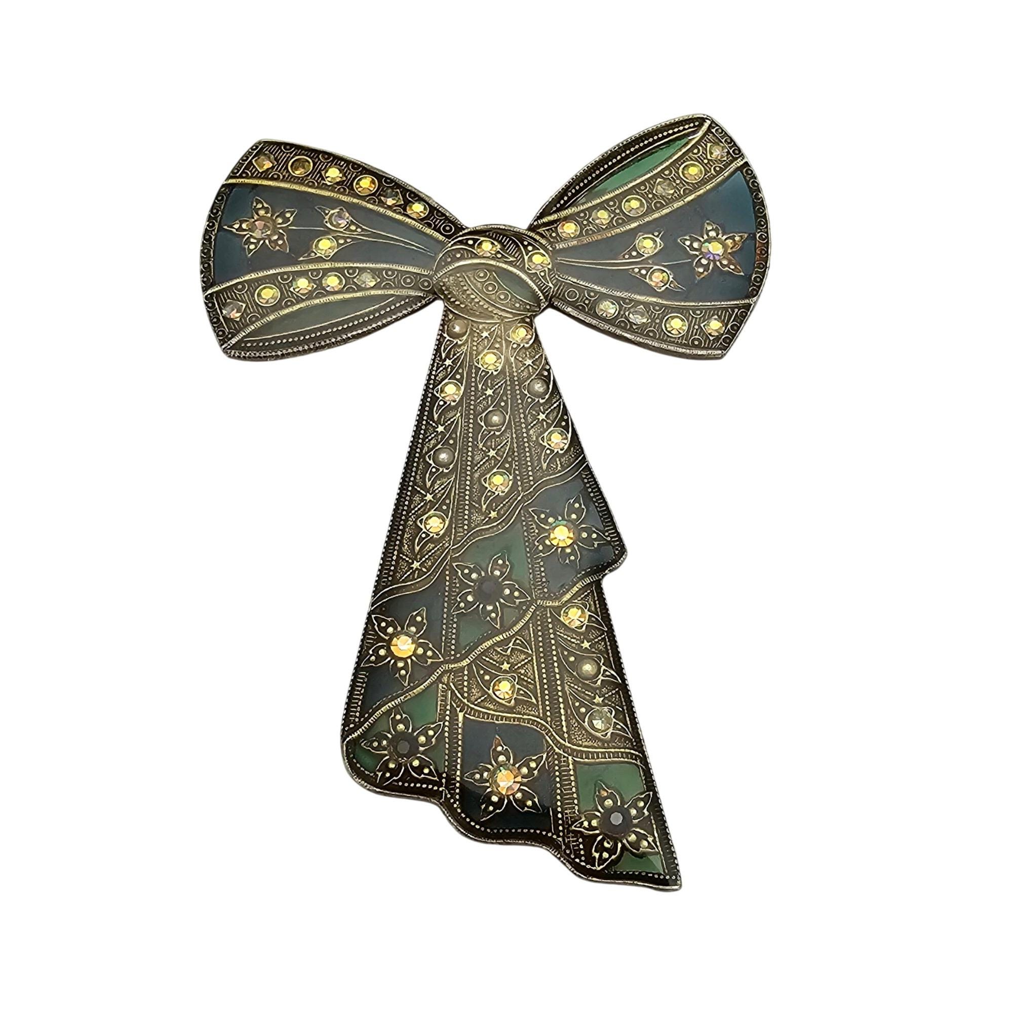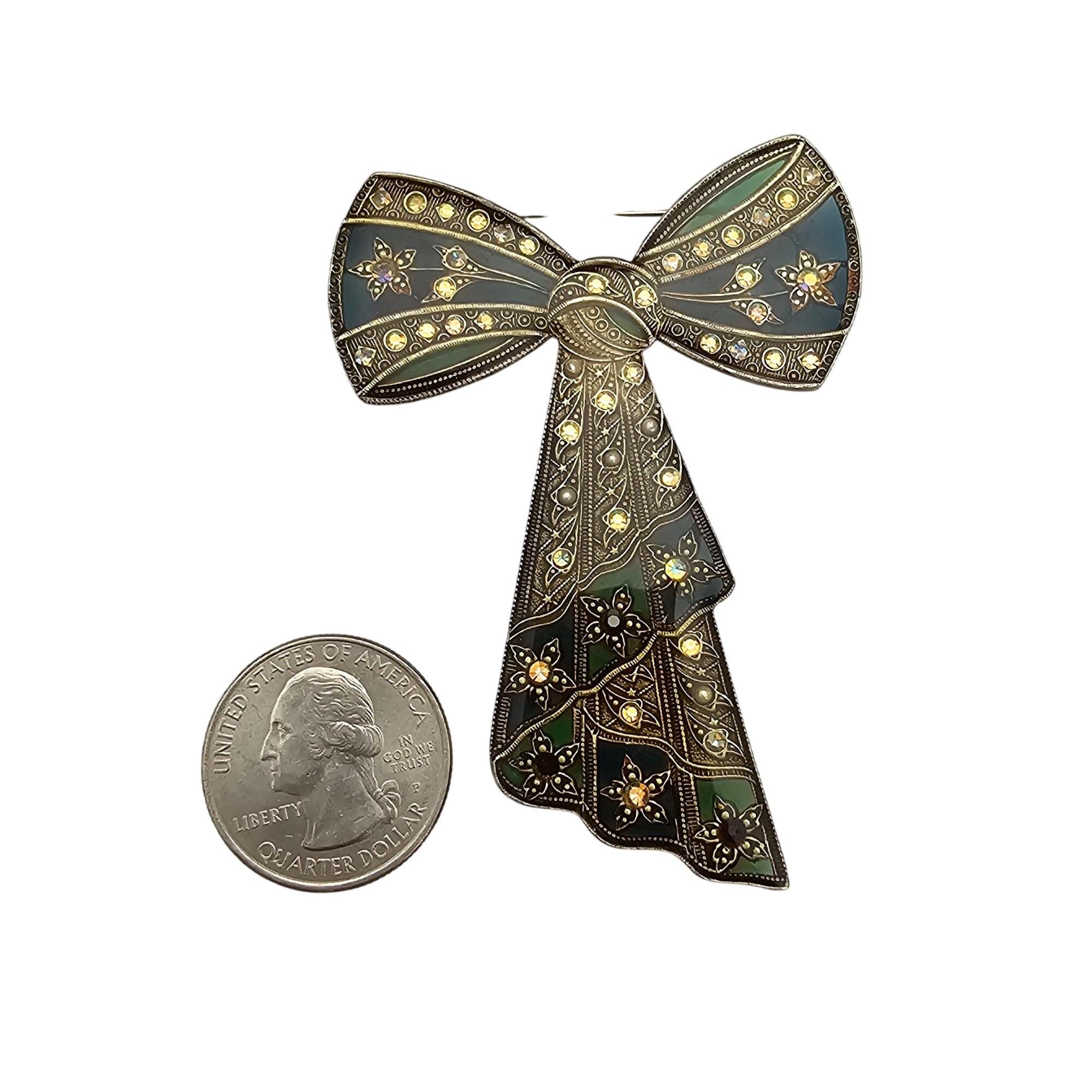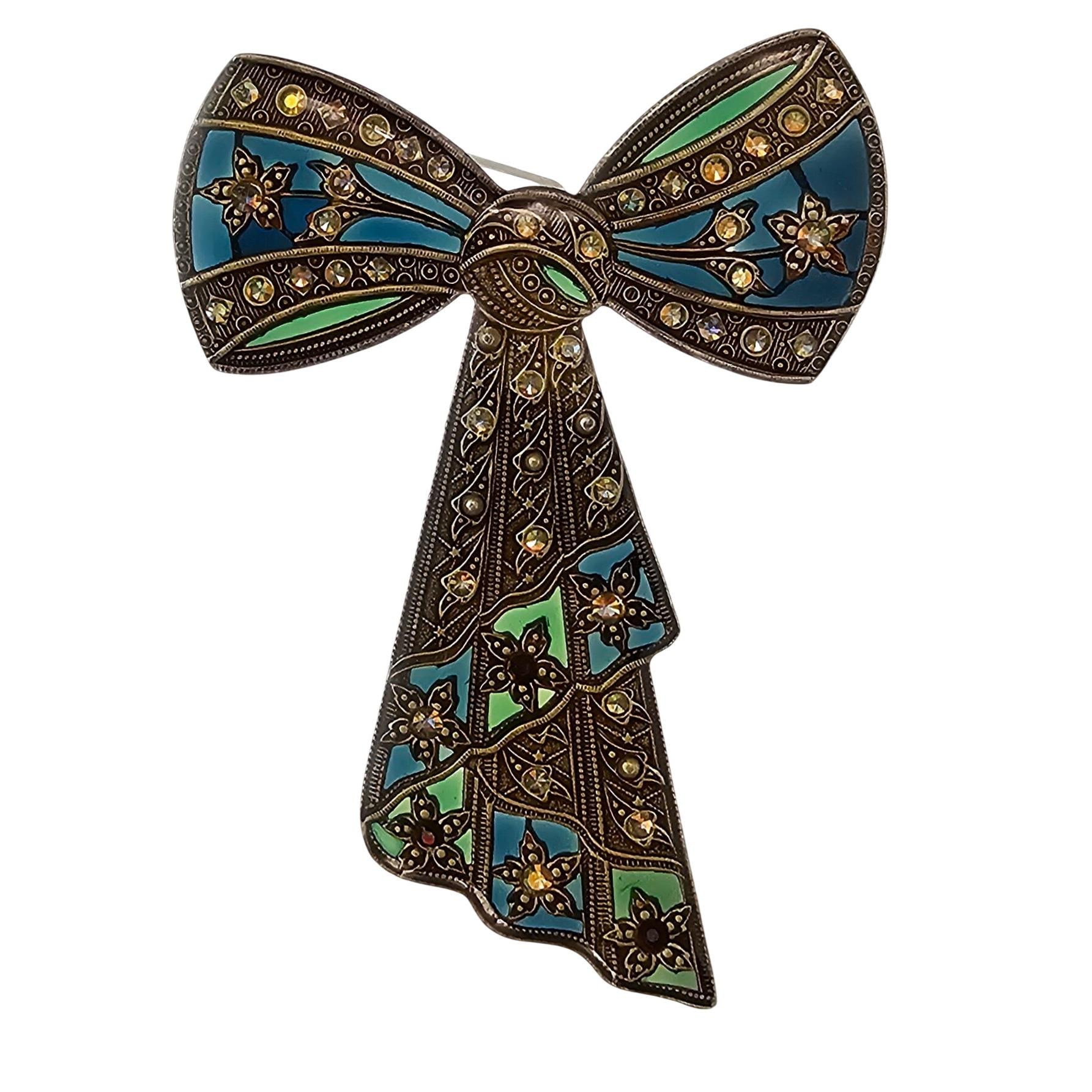Catherine Popesco Blue Green Plique A Jour-Style Rhinestone Bow Brooch J693