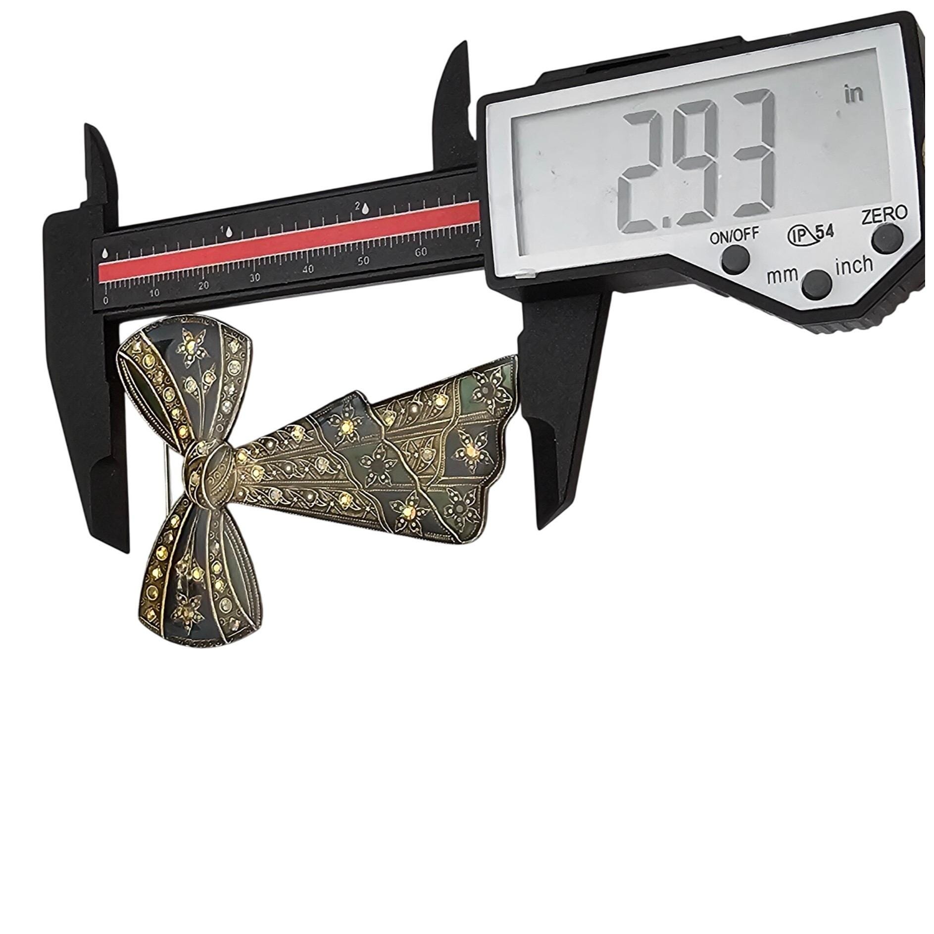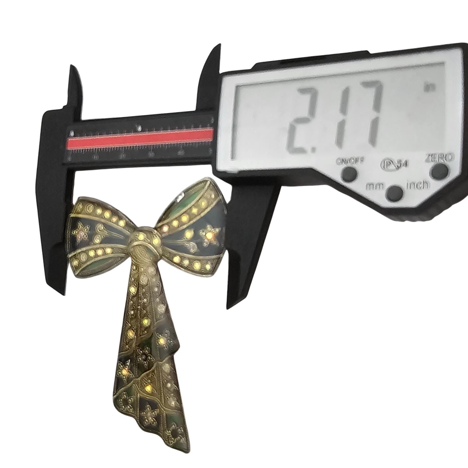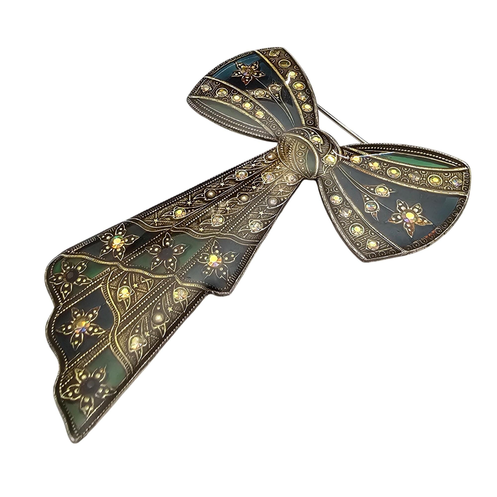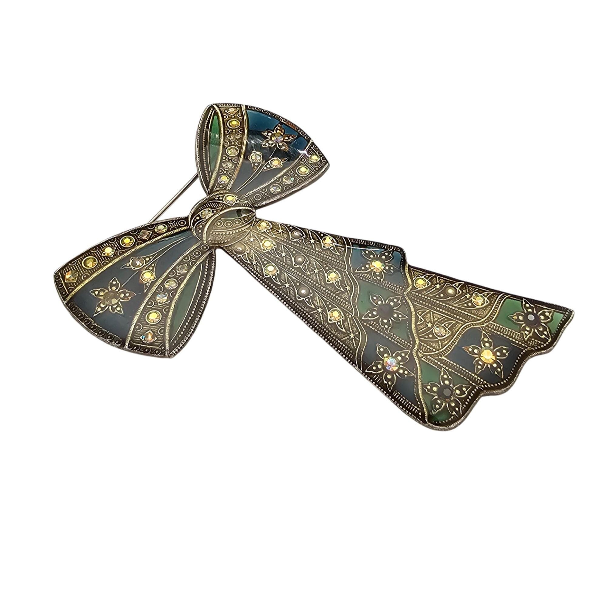 Catherine Popesco Blue Green Plique A Jour-Style Rhinestone Bow Brooch J693