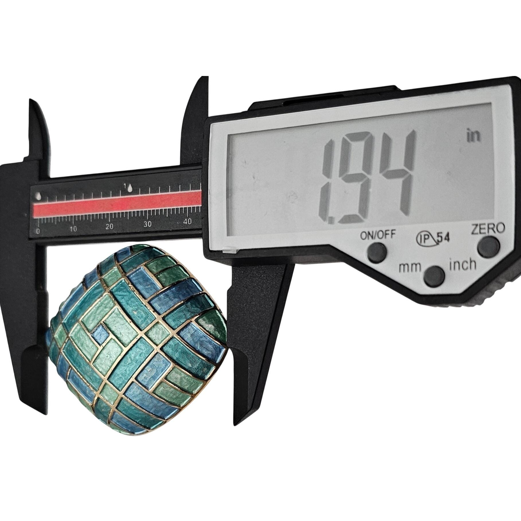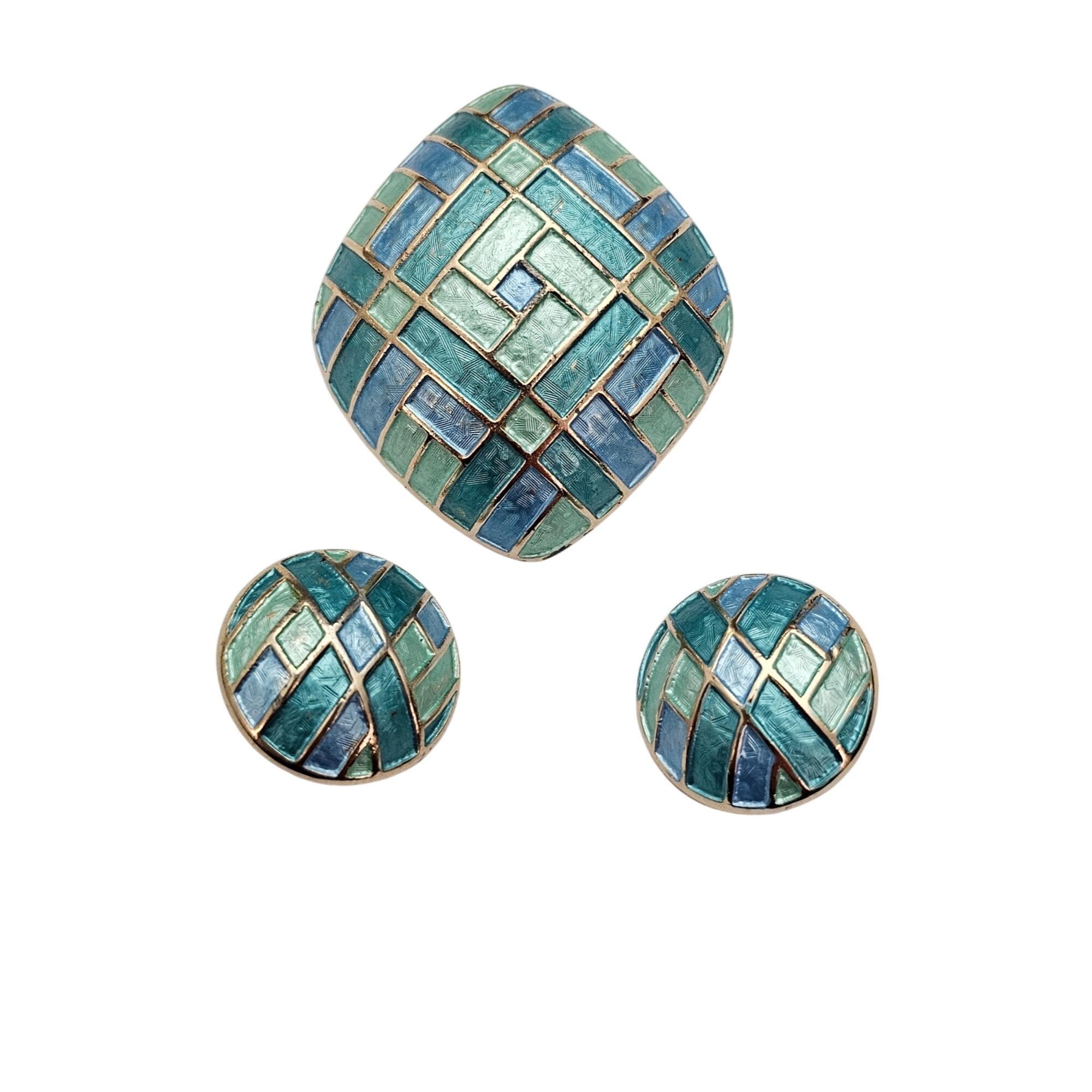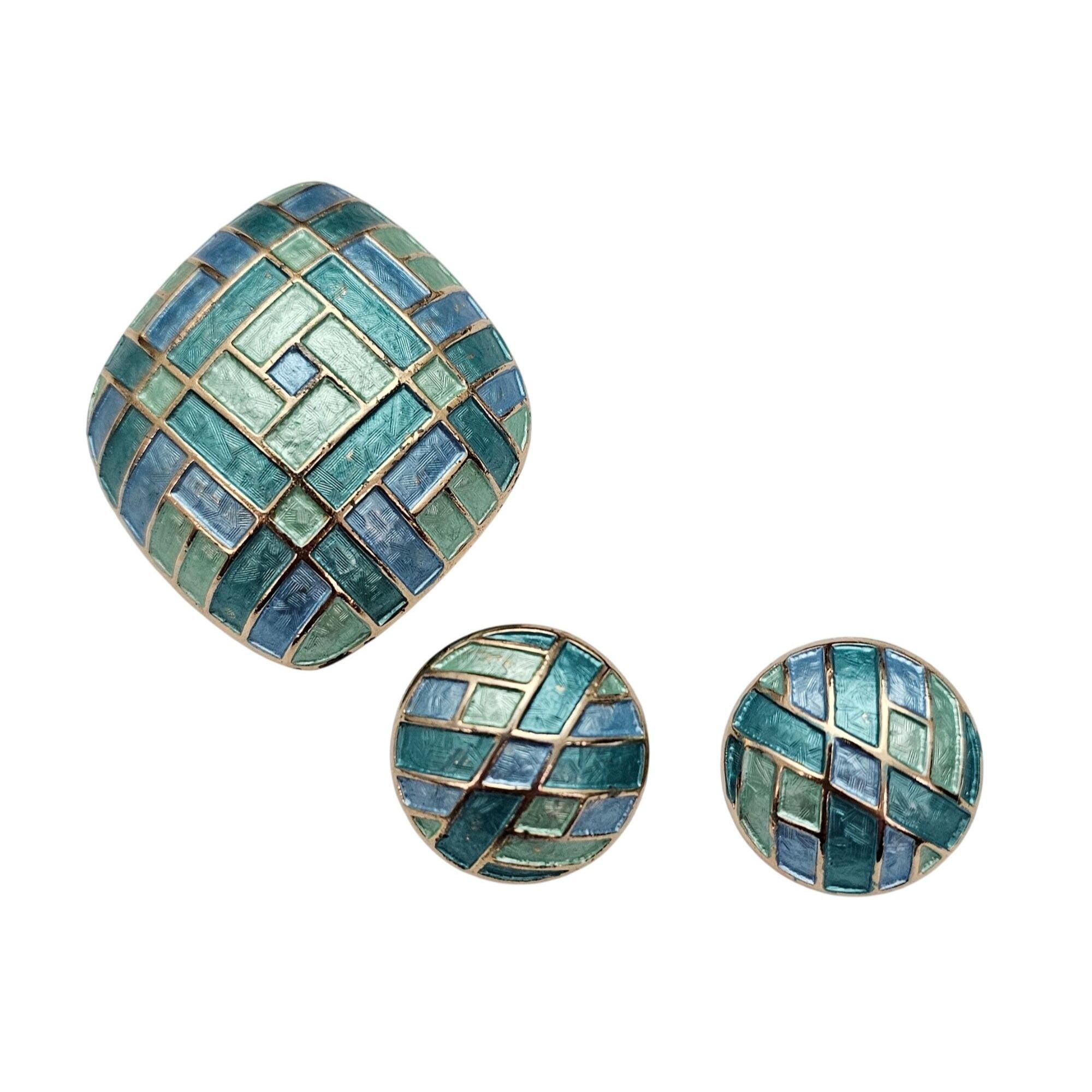 Kramer Blue Green Enamel Geo Brooch Matching Clip On Earrings Signed J700