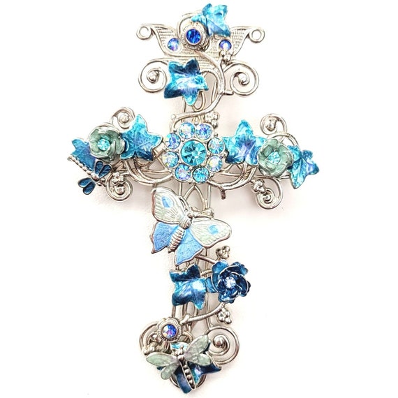 Silver Tone Champleve Style Square Floral Blue Pink Brooch, M295